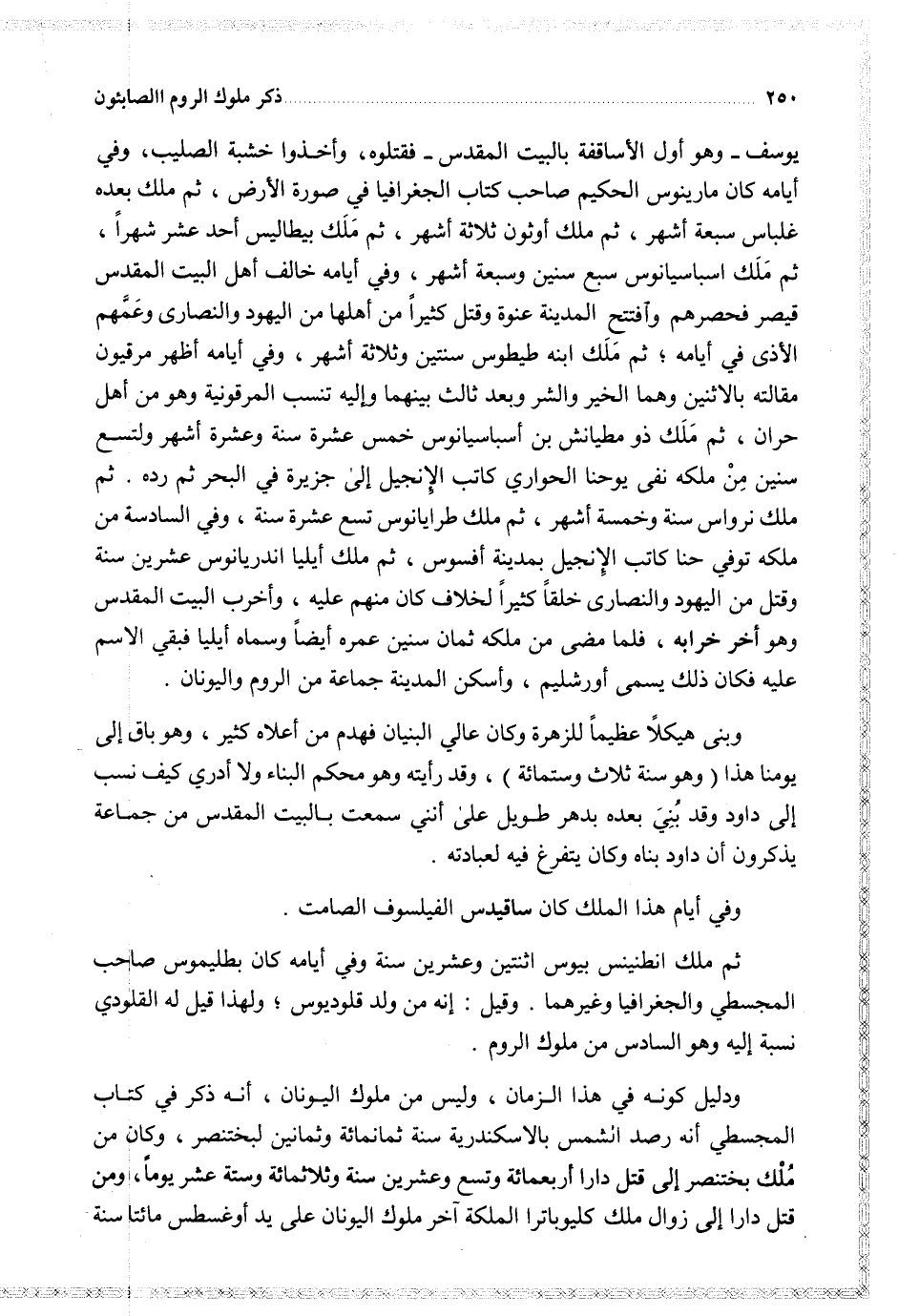 يوسف وهو أول الأساقفة بالبيت المقدس فقتلوه وأخذوا خشبة الصليب وفي أيامه كان مارينوس الحكيم صاحب كتاب الجغرافيا في صورة الأرض ثم ملك بعده غلباس سبعة أشهر ثم ملك أوثون ثلاثة أشهر ثم ملك بيطاليس أحد عشرة شهرا ثم ملك اسباسيانوس سبع سنين وسبعة أشهر وفي أيامه خالف أهل البيت المقدس قيصر فحصرهم وافتتح المدينة عنوة وقتل كثيرا من أهلها من اليهود والنصارى وعمهم الأذى في أيامه ثم ملك ابنه طيطوس سنتين وثلاثة أشهر وفي أيامه أظهر مرقيون مقالته بالاثنين وهما الخير والشر وبعد ثالث بينهما وإليه تنسب المرقونية وهو من أهل حران ثم ملك ذو مطيانش بن أسباسيانوس خمس عشرة سنة وعشرة أشهر ولتسع لسنين من ملكه نفى يوحنا الحواري كاتب الإنجيل إلى جزيرة في البحر ثم رده ثم ملك نرواس سنة وخمسة أشهر ثم ملك طرايانوس تسع عشرة سنة وفي السادسة من ملكه توفي حنا كاتب الإنجيل بمدينة أفسوس ثم ملك أيليا اندريانوس عشرين سنة وقتل من اليهود والنصارى خلقا كثيرا لخلاف كان منهم عليه وأخرب البيت المقدس وهو أخر خرابه فلما مضى من ملكه ثمان سنين عمره أيضا وسماه أيليا فبقي الاسم عليه فكان ذلك يسمى أورشليم وأسكن المدينة جماعة من الروم واليونان