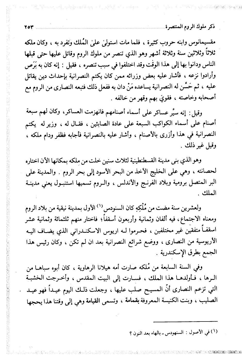 ولعشرين سنة مضت من ملكه كان السنودس الأول بمدينة نيقية من بلاد الروم ومعناه الاجتماع فيه ألفان وثمانية وأربعون أسقفا فاختار منهم ثلثمائة وثمانية عشر اسقفا متفقين غير مختلفين فحرموا له اريوس الاسكندراني الذي يضاف إليه الأريوسية من النصارى ووضع شرائع النصرانية بعد ان لم تكن وكان رئيس هذا الجمع بطرق الإسكندرية