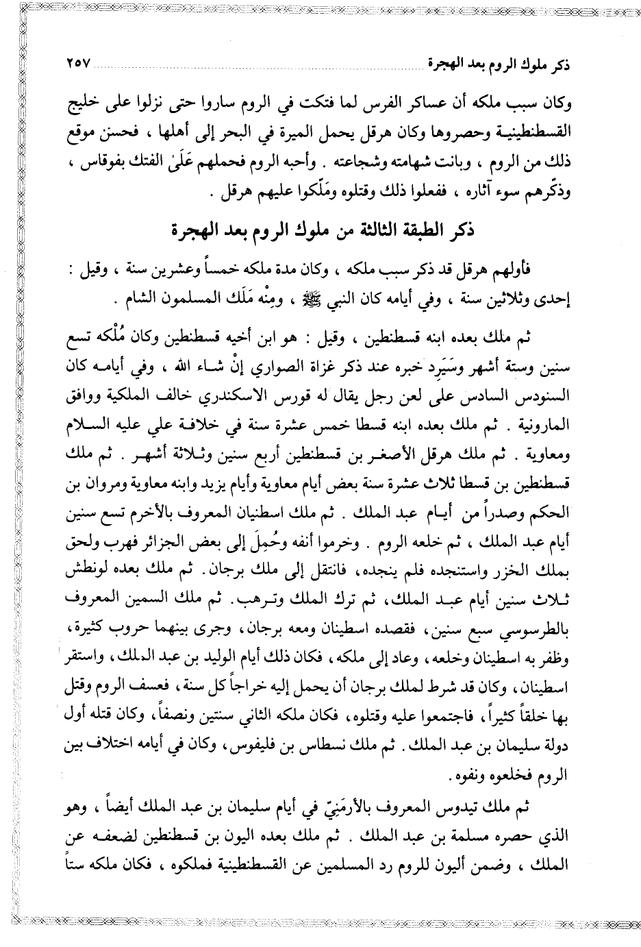 ثم ملك بعده ابنه قسطنطين وقيل هو ابن أخيه قسطنطين وكان ملكه تسع سنين وستة أشهر وسيرد خبره عند ذكر غزاة الصواري إن شاء الله وفي أيامه كان السندس السادس على لعن رجل يقال له قورس الاسكندري خالف المكية ووافق المارونية ثم ملك بعده ابنه قسطا خمس عشرة سنة في خلافة علي عليه السلام ومعاوية ثم ملك هرقل الأصغر بن قسطنطين أربع سنين وثلاثة أشهر ثم ملك قسطنطين بن قسطا ثلاث عشرة سنة بعض أيام معاوية و أيام يزيد وابنه معاوية و مروان بن الحكم وصدرا من أيام عبد الملك ثم ملك اسطنيان المعروف بالأخرم تسع سنين ايام عبد الملك ثم خلعه الروم وخرموا أنفه وحمل إلى بعض الجزائر فهرب ولحق بملك الخزر واستنجده فلم ينجده فانتقل إلى ملك برجان ثم ملك بعده لونطش ثلاث سنين أيام عبد الملك ثم ترك الملك وترهب ثم ملك السمين المعروف بالطرسوسي سبع سنين فقصده اسطينان ومعه برجان وجرى بينهما حروب كثيرة وظفر به اسطينان وخلعه وعاد إلى ملكه فكان ذلك أيام الوليد بن عبد الملك واستقر اسطينان وكان قد شرط لملك برجان أن يحمل إليه خراجا كل سنة فعسف الروم وقتل بها خلقا كثيرا فاجتمعوا عليه وقتلوه فكان ملكه الثاني سنتين ونصفا وكان قتله أول دولة سليمان بن عبد الملك ثم ملك نسطاس بن فليفوس وكان في أيامه اختلاف بين الروم فخلعوه ونفوه