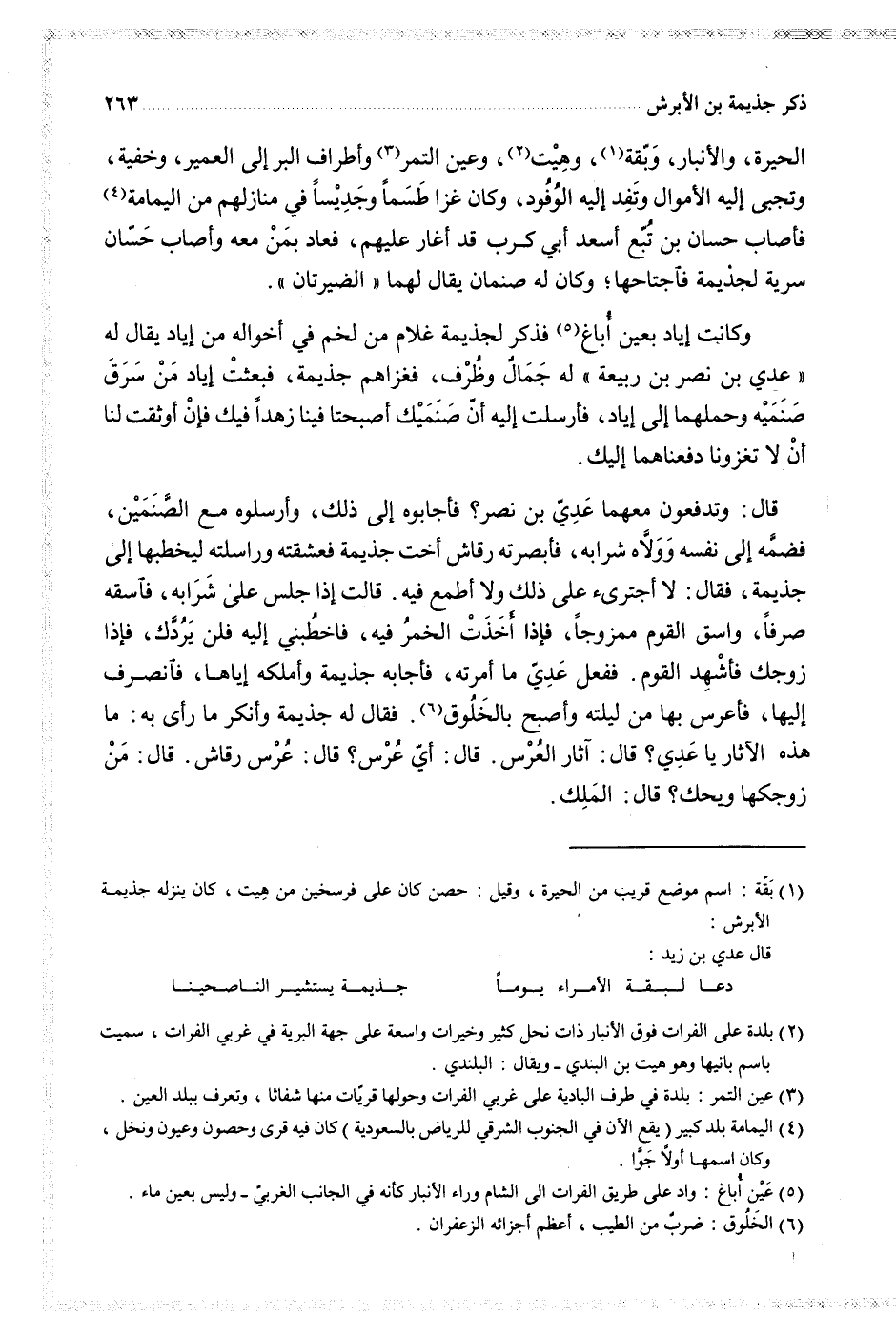 قال وتدفعون معهما عدي بن نصر فأجابوه إلى ذلك وأرسلوه مع الصنمين فضمه إلى نفسه وولاه شرابه فأبصرته رقاش أخت جذيمة فعشقته وراسلته ليخطبها إلى جذيمة فقال لا أجترئ على ذلك ولا أطمع فيه قالت إذا جلس على شرابه فاسقه صرفا واسق القوم ممزوجا فإذا أخذت الخمر فيه فاخطبني إليه فلن يردك فإذا زوجك فأشهد القوم ففعل عدي ما أمرته فأجابه جذيمة وأملكه إياها فانصرف إليها فأعرس بها من ليلته وأصبح بالخلوق فقال له جذيمة وأنكر ما رأى به ما هذه الآثار يا عدي قال آثار العرس قال أي عرس قال عرس رقاش قال ومن زوجكها ويحك قال الملك