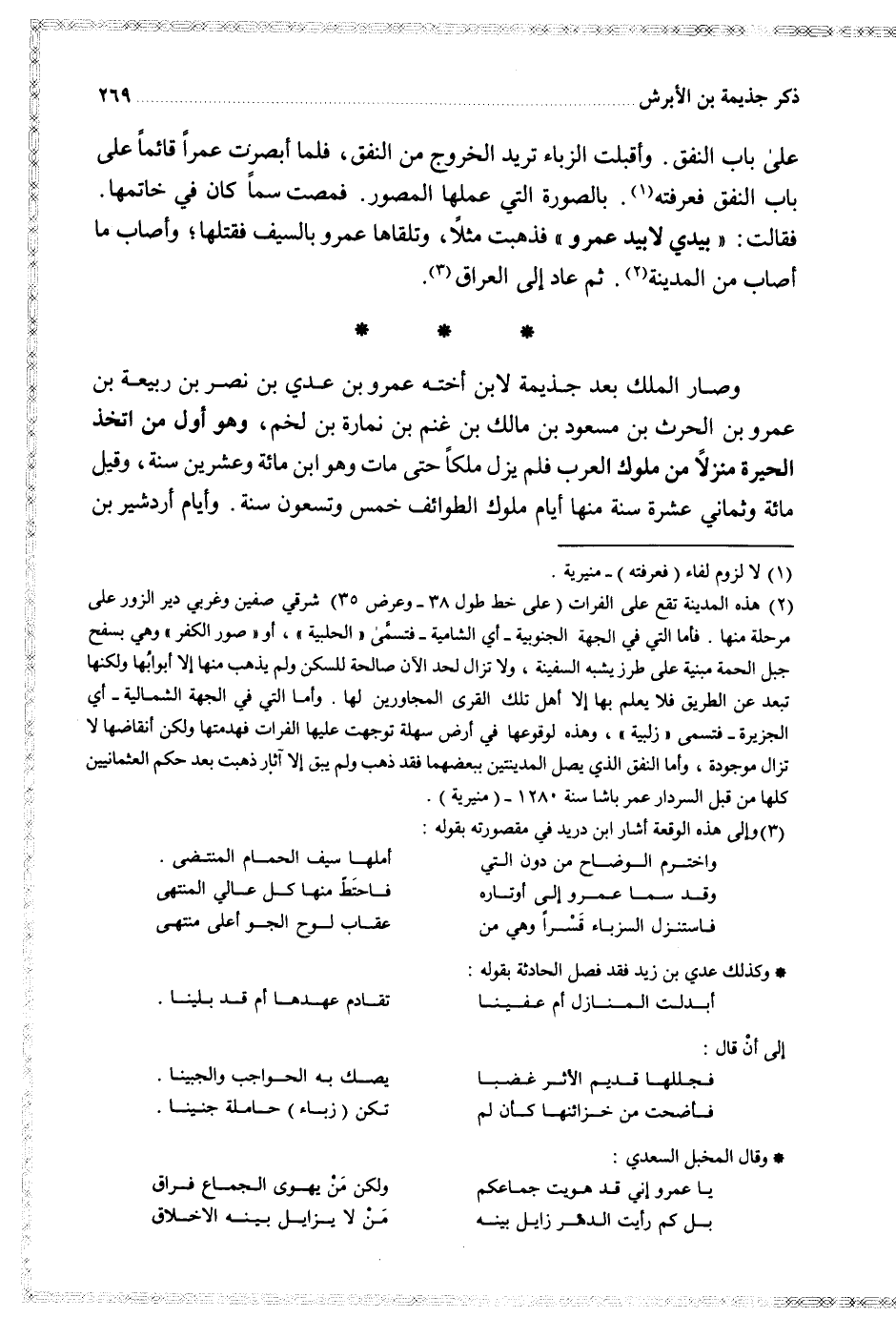 وصار الملك بعد جذيمة لابن أخته عمرو بن عدي بن نصر بن ربيعة بن عمرو بن الحرث بن مسعود بن مالك بن غنم بن نمارة بن لخم وهو أول من اتخذ الحيرة منزلا من ملوك العرب فلم يزل ملكا حتى مات وهو ابن مائة وعشرين سنة وقيل مائة وثماني عشرة سنة منها أيام ملوك الطوائف خمس وتسعون سنة وأيام أردشير بن