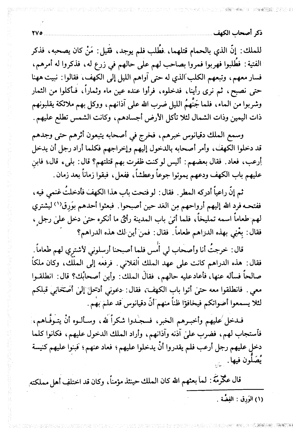 قال خرجت أنا وأصحاب لي أمس فلما أصبحنا أرسلوني لأشترى لهم طعاما فقال هذه الدراهم كانت على عهد الملك الفلاني فرفعه إلى الملك وكان ملكا صالحا فسأله عنها فأعاد عليه حالهم فقال الملك وأين أصحابك قال انطلقوا معي فانطلقوا معه حتى أتو باب الكهف فقال دعوني أدخل إلى أصحابي قبلكم لئلا يسمعوا أصواتكم فيخافوا ظنا منهم أن دقيانوس قد علم بهم