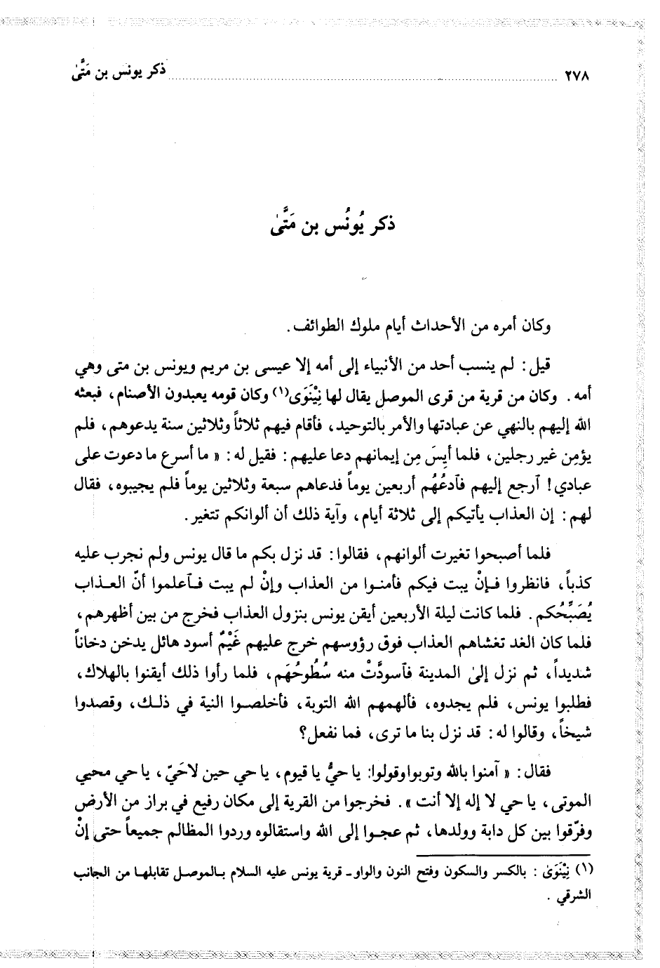 قيل لم ينسب أحد من الأنبياء إلى أمه إلا عيسى بن مريم ويونس بن متى وهي أمه وكان من قرية من قرى الموصل يقال لها نينوى وكان قومه يعبدون الأصنام فبعثه الله إليهم بالنهي عن عبادتها والأمر بالتوحيد فأقام فيهم ثلاثا وثلاثين سنة يدعوهم فلما يؤمن غير رجلين فلما أيس من إيمانهم دعا عليهم فقيل له ما أسرع ما دعوت على عبادي ارجع إليهم فادعهم أربعين يوما فدعاهم سبعة وثلاثين يوما فلم يجيبوه فقال لهم إن العذاب يأتيكم إلى ثلاثة أيام وآية ذلك أن ألوانكم تتغير