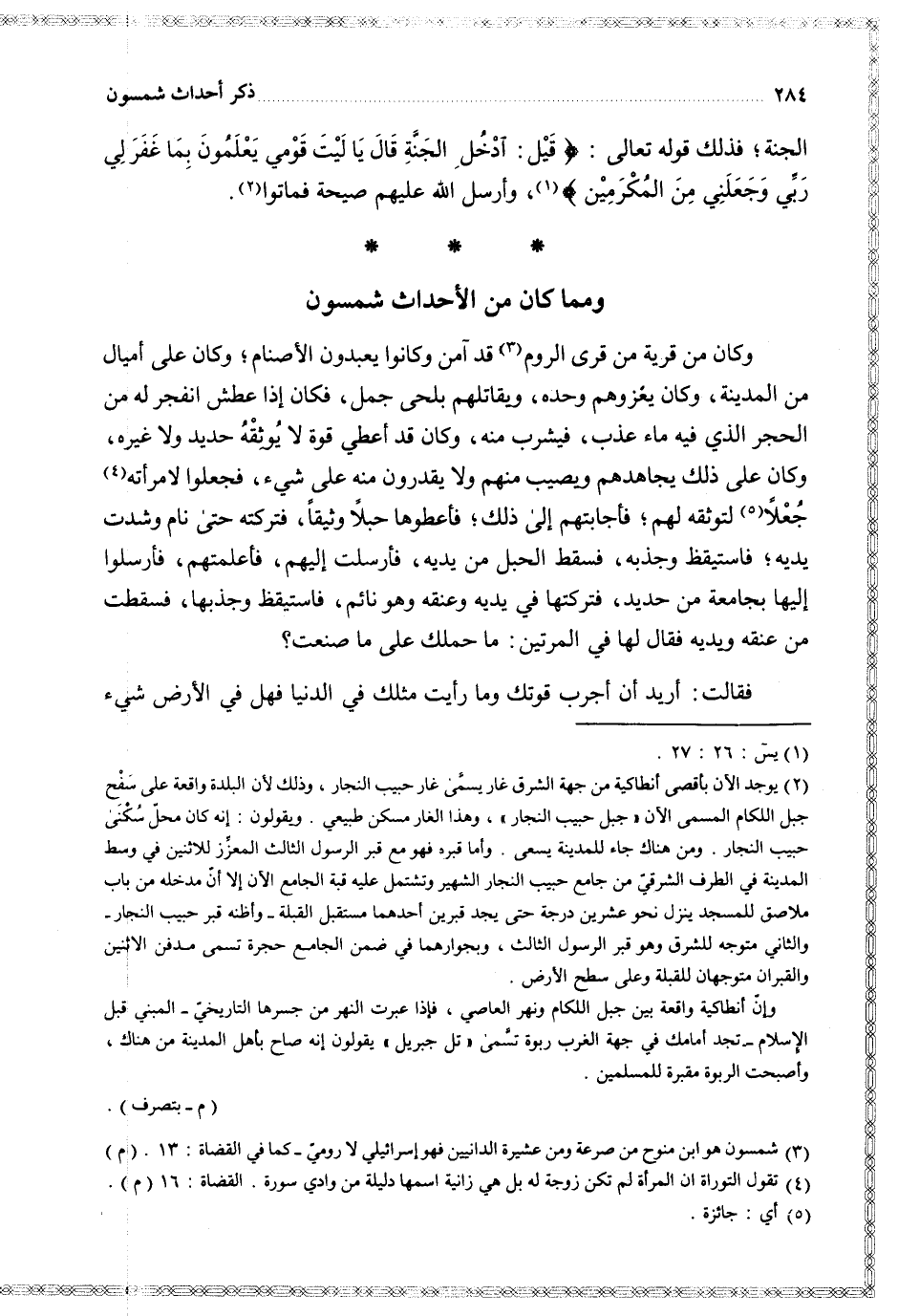 وكان من قرية من قرى الروم قد آمن وكانوا يعبدون الأصنام وكان على أميال من المدينة وكان يغزوهم وحده ويقاتلهم بلحى جمل فكان إذا عطش انفجر له من الحجر الذي فيه ماء عذب فيشرب منه وكان قد أعطى قوة لا يوثقه حديد ولا غيره وكان على ذلك يجاهدهم ويصيب منهم ولا يقدرون منه على شيء فجعلوا لامرأته جعلا لتوثقه لهم فأجابتهم إلى ذلك فأعطوها حبلا وثيقا فتركته حتى نام وشدت يديه فاستيقظ وجذبه فسقط الحبل من يديه فأرسلت إليهم فأعلمتهم فأرسلوا إليها بجامعة من حديد فتركتها في يديه وعنقه وهو نائم فاستيقظ وجذبها فسقطت من عنقه ويديه فقال لها في المرتين ما حملك على ما صنعت