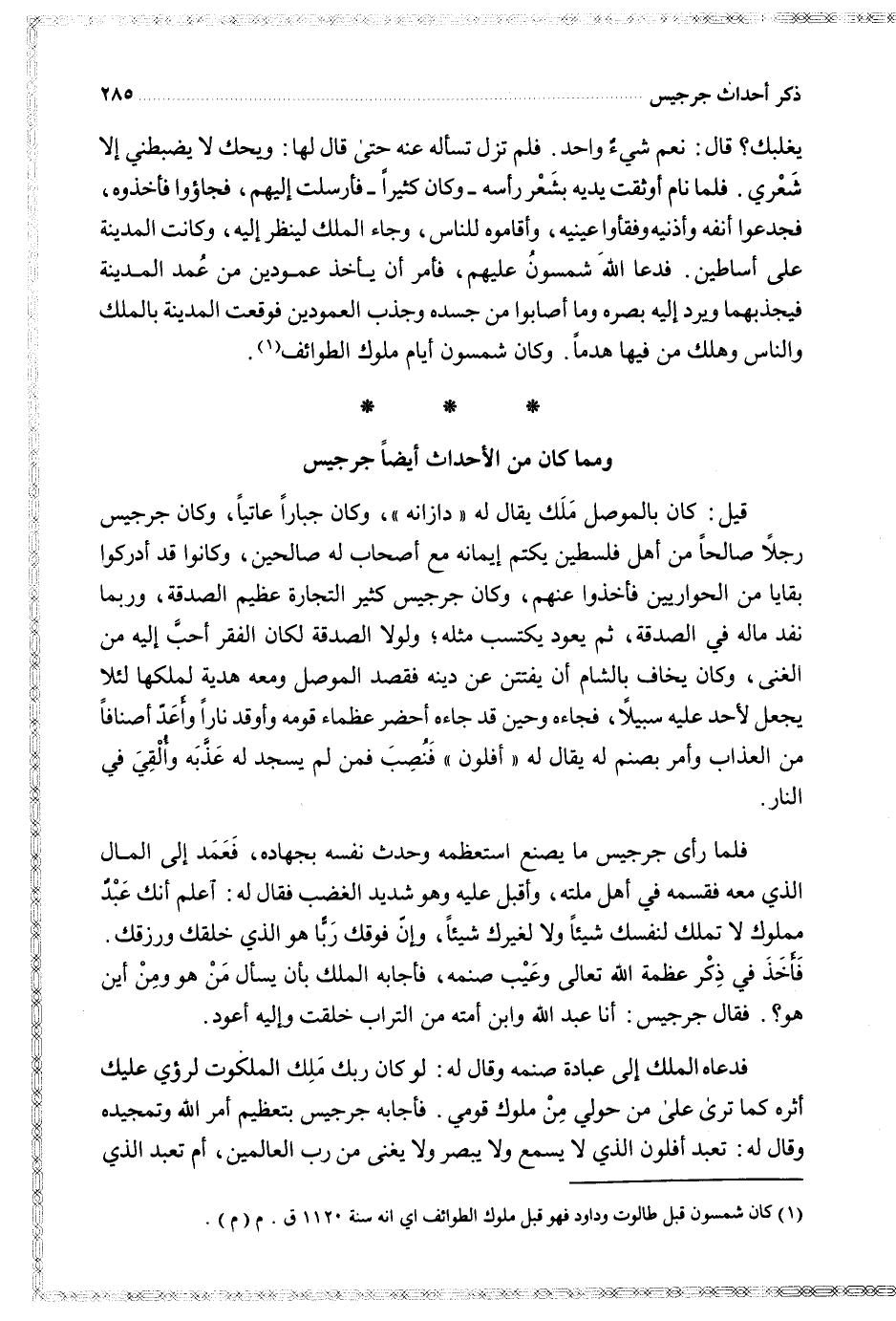 قيل كان بالموصل ملك يقال له (دازانه) وكان جبارا عاتيا وكان جرجيس رجلا صالحا من أهل فلسطين يكتم إيمانه مع أصحاب له صالحين وكانوا قد أدركوا بقايا من الحواريين فأخذوا عنهم وكان جرجيس كثير التجارة عظيم الصدقة وربما كان نفد ماله في الصدقة ثم يعود يكتسب مثله ولولا الصدقة لكان الفقر أحب إليه من الغنى وكان يخاف بالشام أن يفتتن عن دينه فقصد الموصل ومعه هدية لملكها لئلا يجعل لأحد عليه سبيلا فجاءه وحين قد جاءه أحضر عظماء قومه وأوقد نارا وأعد أصنافا من العذاب وأمر بصنم له يقال له (أفلون) فنصب فمن لم يسجد له عذبه وألقي في النار