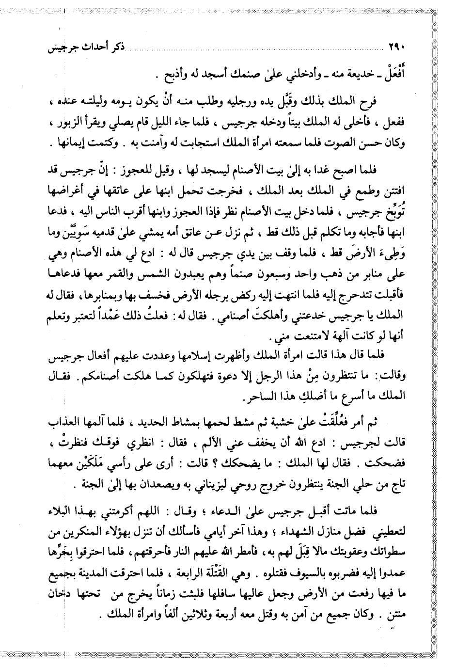 فلما قال هذا قالت امرأة الملك وأظهرت إسلامها وعددت عليهم أفعال جرجيس وقالت ما تنتظرون من هذا الرجل إلا دعوة فتهلكون كما هلكت أصنامكم فقال الملك ما أسرع ما أضلك هذا الساحر