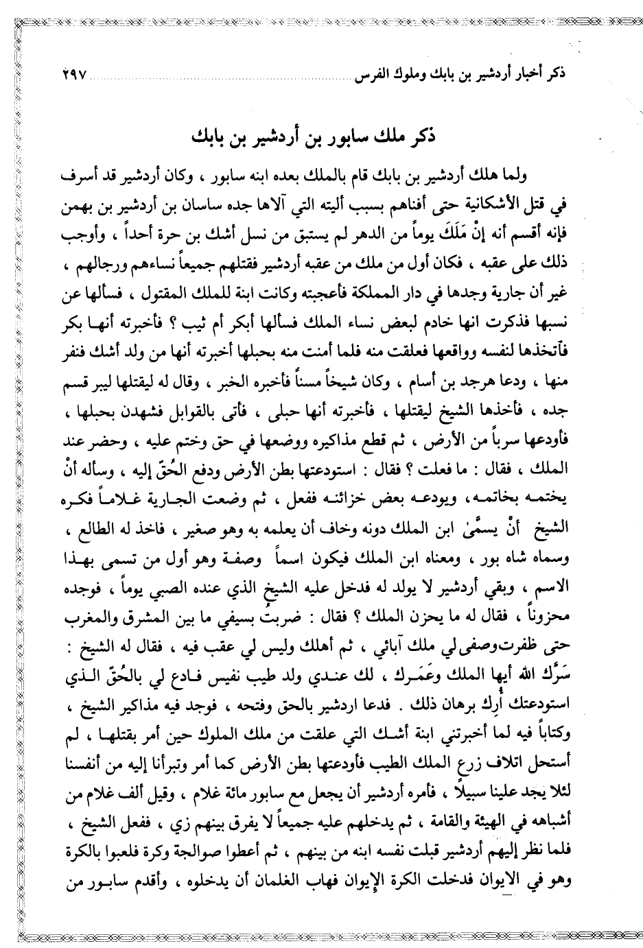 ولما هلك أردشير بن بابك قام بالملك بعده ابنه سابور وكان أردشير قد أسرف في قتل الأشكانية حتى أفناهم بسبب أليته التي آلاها جده ساسان بن أردشير بن بهمن فإنه أقسم أنه إن ملك يوما من الدهر لم يستبق من نسل أشك بن حرة أحدا وأوجب ذلك على عقبة فكان أول من ملك من عقبة أردشير فقتلهم جميعا نساءهم ورجالهم غير أن جارية وجدها في دار المملكة فأعجبته وكانت ابنة للملك المقتول فسألها عن نسبها فذكرت انها خادم لبعض نساء الملك فسألها أبكر أم ثيب فأخبرته أنها بكر فاتخذها لنفسه وواقعها فعلقت منه فلما أمنت منه بحبلها أخبرته أنها من ولد اشك فنفر منها ودعا هرجد بن أسام وكان شيخا مسنا فأخبره الخبر وقال له ليقتلها ليبر قسم جده فأخذها الشيخ ليقتلها فأخبرته أنها حبلى فأتى بالقوابل فشهدن بحبلها فأدعها سربا من الأرض ثم قطع مذاكيره ووضعها في حق وختم عليه وحضر عند الملك فقال ما فعلت فقال استودعتها بطن الأرض ودفع الحق إليه وسأله أن يختمه بخاتمه ويودعه بعض خزائنه ففعل ثم وضعت الجارية غلاما فكره الشيخ أن يسمى ابن الملك دونه وخاف أن يعلمه به وهو صغير فاخذ له الطالع وسماه شاه بور ومعناه ابن الملك فيكون اسما وصفة وهو أول من تسمى بهذا الاسم وبقي أردشير لا يولد له فدخل عليه الشيخ الذي عنده الصبي يوما فوجده محزونا فقال له ما يحزن الملك فقال ضربت بسيفي ما بين المشرق والمغرب حتى ظفرت وصفى لي ملك آبائي ثم أهلك وليس لي عقب فيه فقال له الشيخ سرك الله أيها الملك وعمرك لك عندي ولد طيب نفيس فادع لي بالحق الذي استودعتك أرك برهان ذلك فدعا اردشير بالحق وفتحه فوجد فيه مذاكير الشيخ وكتابا فيه لما أخبرتني ابنة أشك التي علقت من ملك الملوك حين أمر بقتلها لم أستحل اتلاف زرع الملك الطيب فاودعتها بطن الأرض كما أمر وتبرأنا إليه من أنفسنا لئلا يجد علينا سبيلا فأمره أردشير أن يجعل مع سابور مائة غلام وقيل ألف غلام من أشباهه في الهيئة والقامة ثم يدخلهم عيله جميعا لا يفرق بينهم زي ففعل الشيخ فلما نظر إليهم أردشير قبلت نفسه ابنه من بينهم ثم أعطوا صوالجة وكرة فلعبوا بالكرة وهو في الايوان فدخلت الكرة الإيوان فهاب الغلمان أن يدخلوه وأقدم سابور من