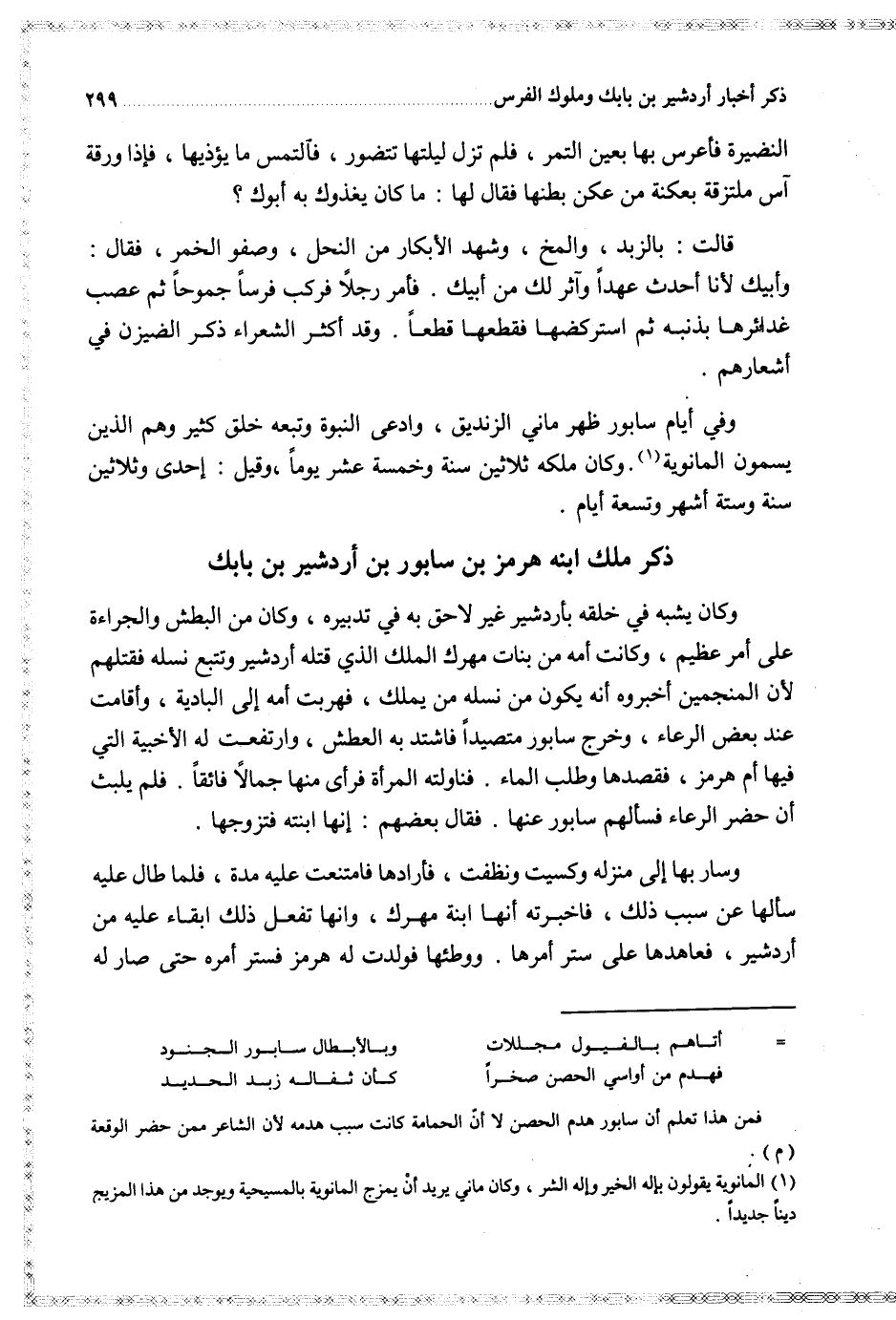 وفي أيام سابور ظهر ماني الزنديق وادعى النبوة وتبعه خلق كثير وهم الذين يسمون المانوية وكان ملكه ثلاثين سنة وخمسة عشر يوما وقيل إحدى وثلاثين سنة وستة أشهر وتسعة أيام