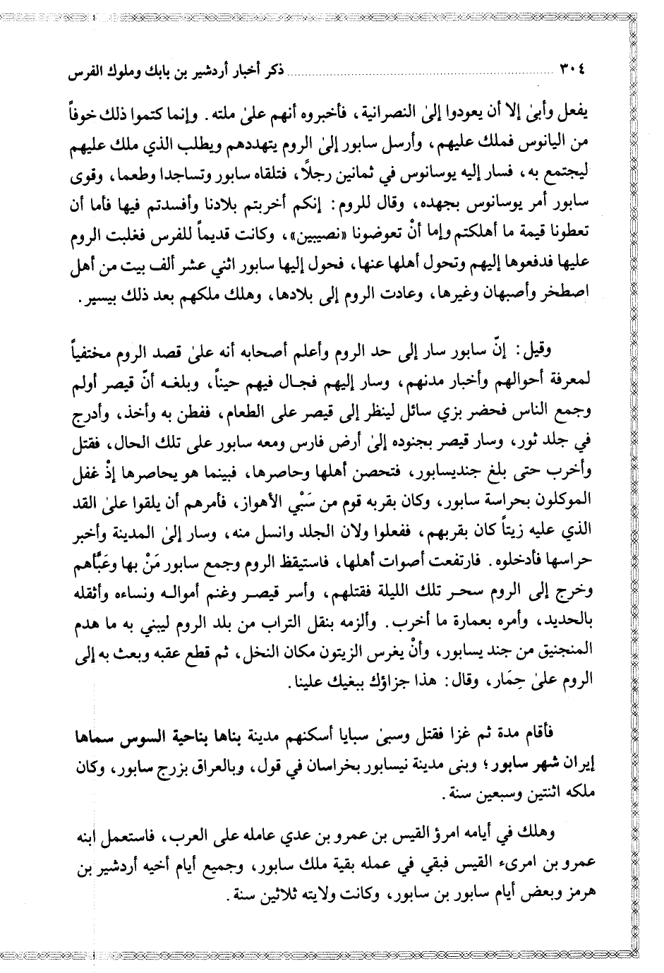 فأقام مدة عمر غزا فقتل وسبى سبايا أسكنهم مدينة بناها بناحية السوس سماها إيران شهر سابور وبنى مدينة نيسابور بخراسان في قول وبالعراق بزرج سابور وكان ملكه اثنتين وسبعين سنة