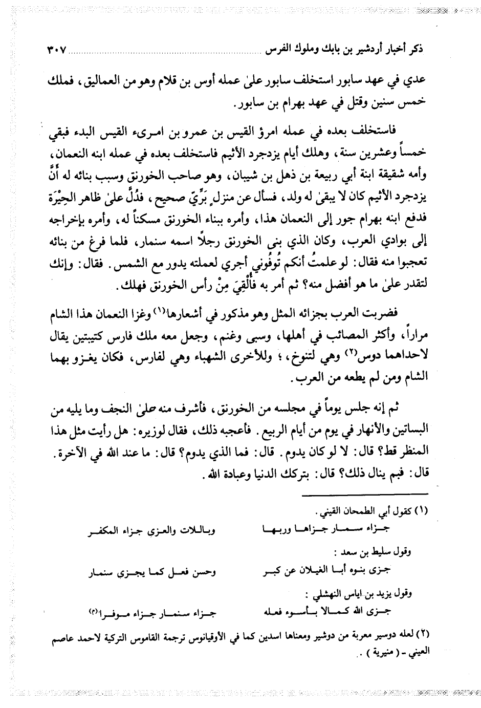 فضربت العرب بجزائه المثل وهو مذكور في أشعارها وغزا النعمان هذا الشام مرارا وأكثر المصائب في أهلها وسبى وغنم وجعل معه ملك فارس كتيبتين يقال لاحداهما دوس وهي لتنوخ والأخرى الشهباء وهي لفارس فكان يغزو بهما الشام ومن لم يطعه من العرب