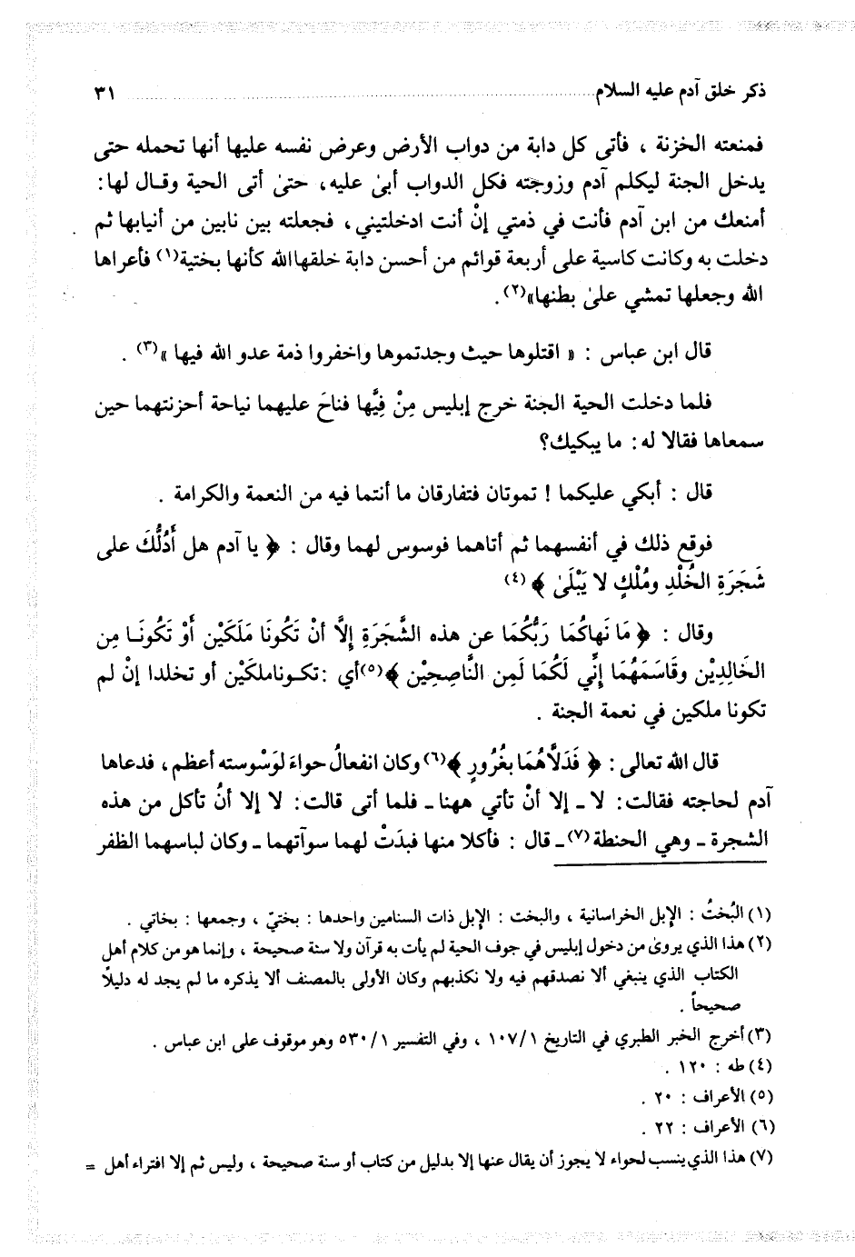 فمنعه الخزنة فأتى كل دابة من دواب الأرض وعرض نفسه عليها أنها تحمله حتى يدخل الجنة ليكلم أدم وزوجته فكل الدواب أبى عليه حتى أتى الحية وقال لها أمنعك من ابن آدم فأنت في ذمتي إن أنت ادخلتني فجعلته بين نابين من أنيابها ثم دخلت به وكانت كاسية على أربعة قوائم من أحسن دابة خلقها الله كأنها بختية فأعراها الله وجعلها تمشي على بطنها