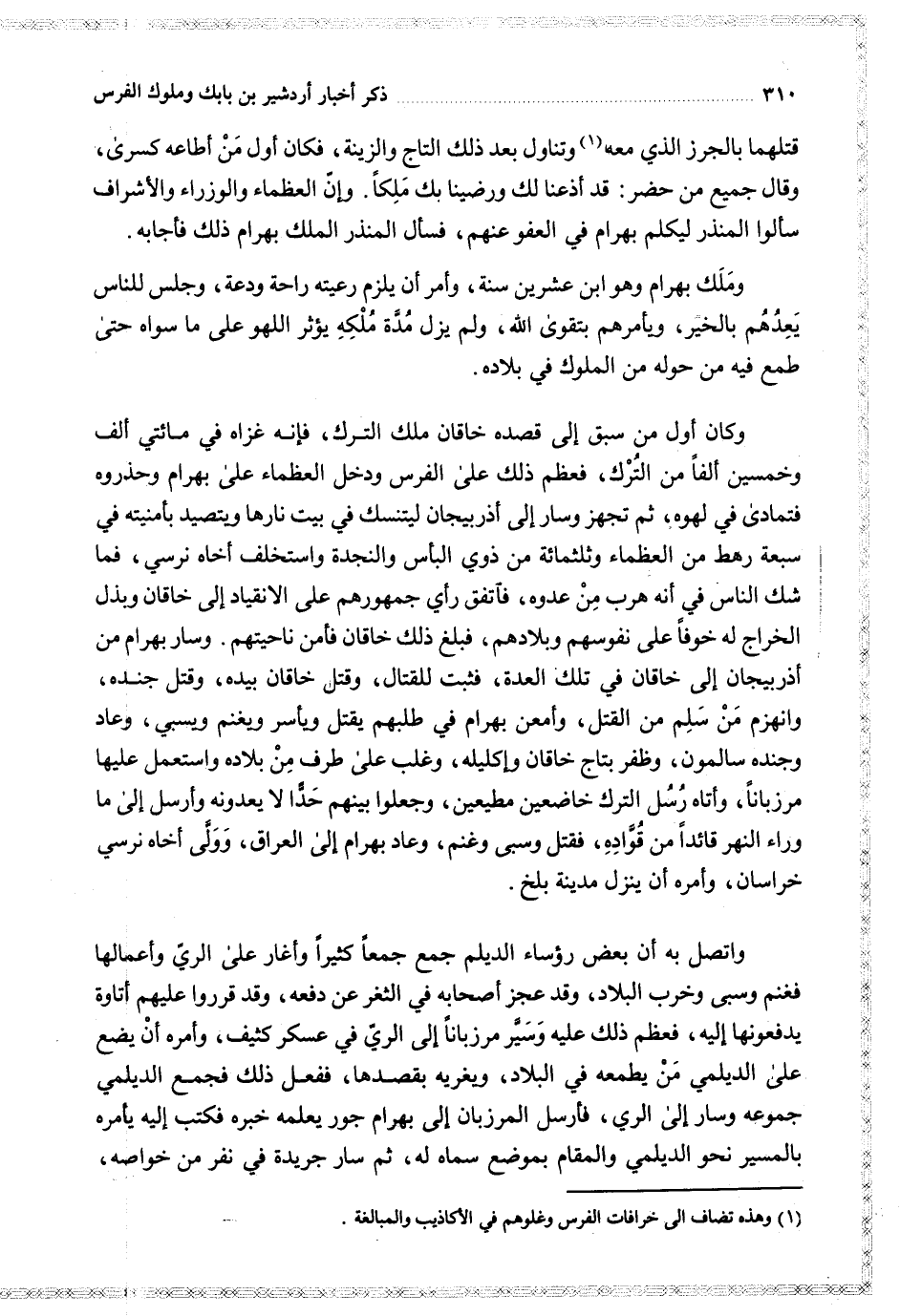 قتلهما بالجرز الذي معه وتناول بعد ذلك التاج والزينة فكان أول من أطاعه كسرى وقال جميع من حضر قد أذعنا لك ورضينا بك ملكا وإن العظماء والوزراء والأشراف سألوا المنذر ليكلم بهرام في العفو عنهم فسأل المنذر الملك بهرام ذلك فأجابه