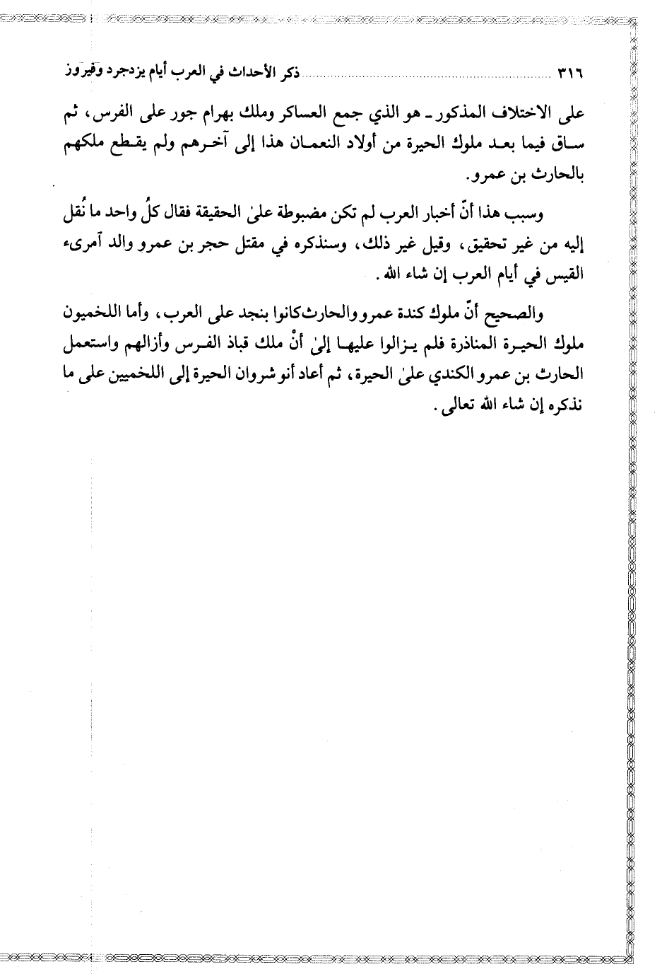 على الاختلاف المذكور هو الذي جمع العساكر وملك بهرام جور على الفرس ثم ساق فيما بعد ملوك الحيرة من أولاد النعمان هذا إلى آخرهم ولم يقطع ملكهم بالحارث بن عمرو