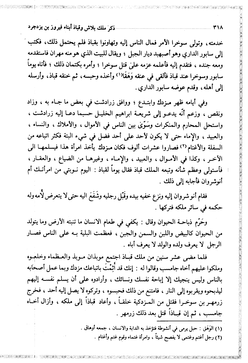 خدمته وتولى سوخار الأمر فمال الناس إليه وتهاونوا بقباذ فلم يحتمل ذلك فكتب إلى سابور الداري وهو أصبهبد ديار الجبل ويقال للبيت الذي هو منه مهران فاستقدمه ومعه جنده فتقدم إليه فأعلمه عزمه على قتل سوخرا وأمره بكتمان ذلك فأتاه يوما سابور وسوخرا عند قباذ فألقى في عنقه وهقا وأخذه وحبسه ثم خنقه قباذ وأرسله إلى أهله وقدم عوضه سابور الداري