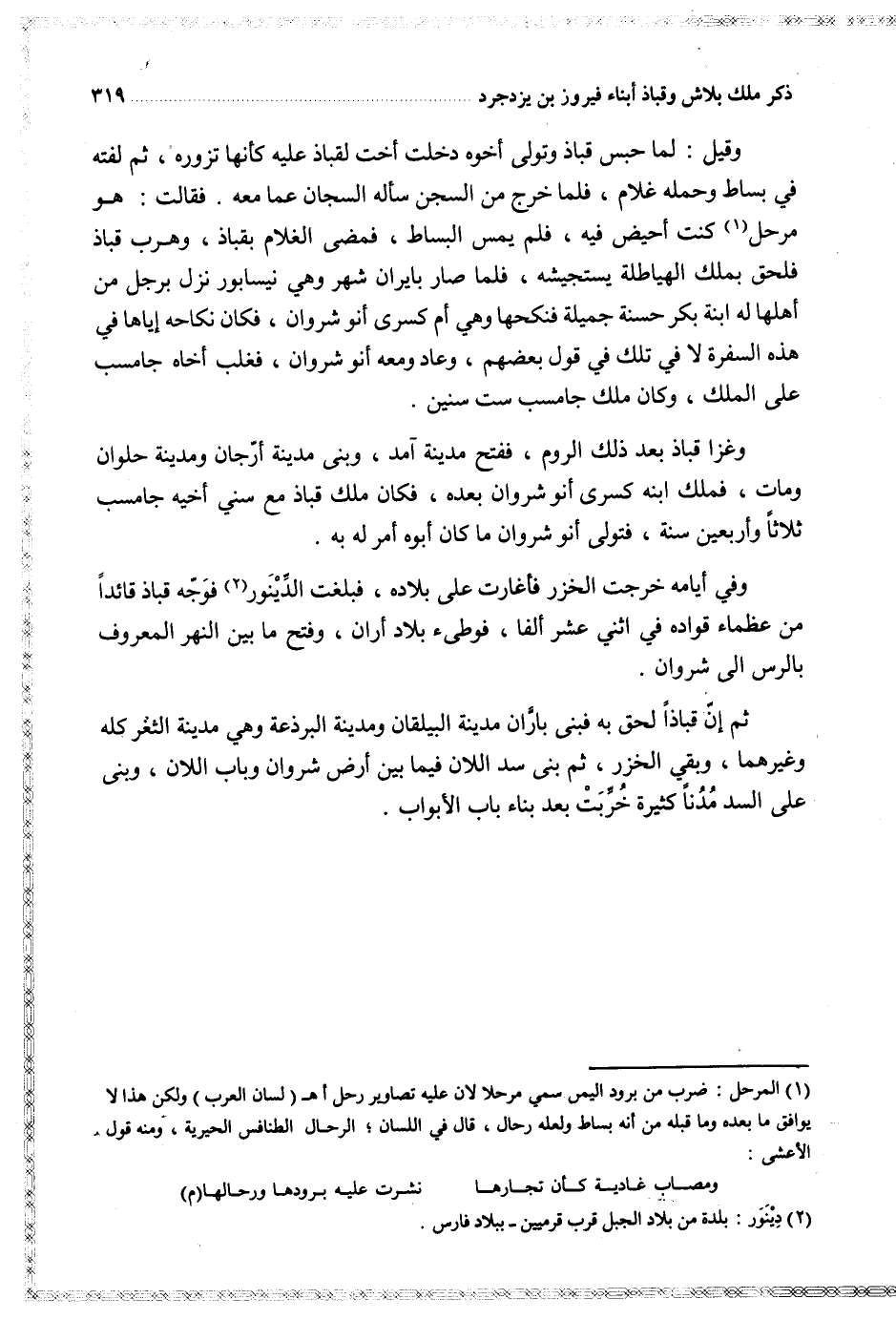 وغزا قباذ بعد ذلك اليوم ففتح مدينة آمد وبنى مدينة أرجان ومدينة حلوان ومات فملك ابنه كسرى أنوشروان بعده فكان ملك قباذ مع سني أخيه جامسب ثلاثا وأربعين سنة فتولى أنوشروان ما كان أبوه أمر له به