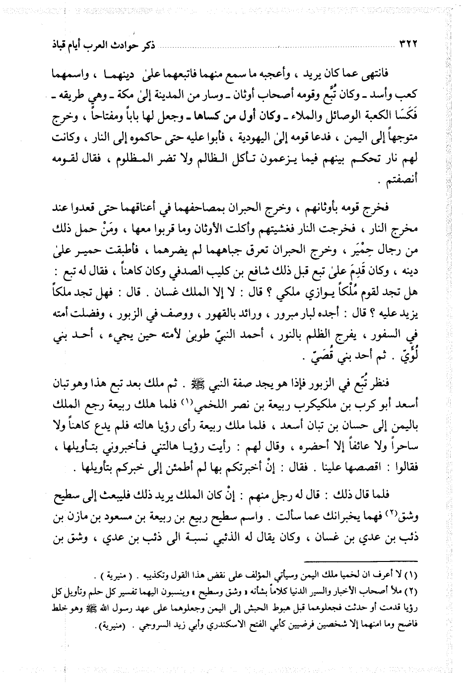 فخرج قومه بأوثانهم وخرج الحبران بمصاحفهما في أعناقهماحتى قعدوا عند مخرج النار فخرجت النار فغشيت النار فغشيتهم وأكلت الأوثان وما قربوا معها ومن حمل ذلك من رجال حمير وخرج الحبران تعرق جباههما لم يضرهما فأطبقت حمير على دينه وكان قدم على تبع قبل ذلك شافع بن كليب الصدفي وكان كاهنا فقال له تبع هل تجد لقوم ملكا يوازي ملكي قال لا إلا الملك غسان قال هل تجد ملكا يزيد عليه قال أجده لبار مبرور ورائد بالقهور ووصف في الزبور وفضلت أمته في السفور يفرج الظلم بالنور أحمد النبي طوبى لأمته حين يجيئ أحد بني لؤي ثم أحد بني قصي