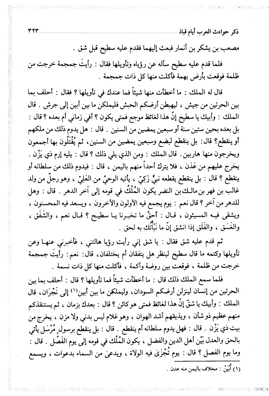 قال له الملك ما أخطأت منها شيئا فما عندك في تأويلها فقال أحلف بما بين الحرتين من جيش ليهبطن أرضكم الحبش فليملكن ما بين أبين إلى جرش قال الملك وأبيك يا سطيح إن هذا لغائظ موجع فمتى يكون أفي زماني أم بعده قال بل بعده بحين ستين سنة أو سبعين يمضين من السنين ثم يقتلون بها أجمعون ويخرجون منها هاربين قال الملك ومن الذي يلي ذلك قال يليه إرم ذي يزن يخرج عليهم من عدن فلا يترك أحدا منهم باليمن قال فيدوم ذلك من سلطانه أو ينقطع قال بل ينقطع يقطعه نبي زكي يأتيه الوحي من العلي وهو رجل من ولد غالب بن فهر بن مالك بن النضر يكون الملك في قومه إلى آخر الدهر قال وهل للدهر من آخر قال نعم يوم يجمع فيه الأولون والآخرون ويسعد فيه المحسنون ويشقى فيه المسيئون قال أحق ما تخبرنا يا سطيح قال نعم والشفق والغسق والفلق إذا انشق إن ما نبأتك به لحق