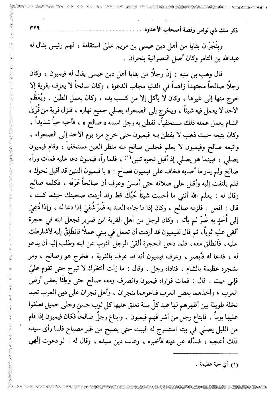 قال وهب بن منبه إن رجلا من بقايا أهل دين عيسى يقال له فيميون وكان رجلا صالحا مجتهدا زاهدا في الدنيا مجاب الدعوة وكان سائحا لا يعرف بقرية إلا خرج منها إلى غيرها وكان لا يأكل إلا من كسب يده وكان يعمل الطين ويعظم الأحد لا يعمل فيه شيئا ويخرج إلى الصحراء يصلي جميع نهاره فنزل قرية من قرى الشام يعمل عمله ذلك مستخفيا ففطن به رجل اسمه صالح فأحبه حبا شديدا وكان يتبعه حيث ذهب لا يفطن به فيميون حتى خرجلا مرة يوم الأحد إلى الصحراء واتبعه صالح وفيميون لا يعلم فجلس صالح منه منظر العين مستخفيا وقام فيميون يصلي فبينما هو يصلي إذ أقبل نحوه تنين فلما رآه فيميون دعا عليه فمات ورآه صالح ولم يدر ما أصابه فخاف على فيميون فصاح يا فيميون التنين قد أقبل نحوك فلم يلتفت إليه وأقبل على صلاته حتى أمسى وعرف أن صالحا عرفه فكلمه صالح وقال له يعلم الله إنني ما أحببت شيئا حبك قط وقد أردت صحبتك حيثما كنت قال افعل فلزمه صالح وكان إذا ما جاءه العبد به ضر شفي إذا دعا له وإذا دعي إلى أحد به ضر لم يأته وكان لرجل من أهل القرية ابن ضرير فجعل ابنه في حجرة ألقى عليه ثوبا ثم قال لفيميون قد أردت أن تعمل في بيتي عملا فانطلق إليه لأشارطك عليه فانطلق معه فلما دخل الحجرة ألقى الرجل الثوب عن ابنه وطلب إليه أن يدعو له فدعى فابصر وعرف فيميون أنه قد عرف بالقرية فخرج هو وصالح ومر بشجرة عظيمة بالشام فناده رجل وقال ما زلت أنتظرك لا تبرح حتى تقوم علي فإني ميت قال فمات فواراه فيميون وانصرف ومعه صالح حتى وطئا بعض أرض العرب وأخذهما بعض العرب فباعوهما بنجران وأهل نجران على دين العرب تعبد نخلة طويلة بين أظهرهم لها عيد كل سنة تعلق عليها كل ثوب حسن وحلى جميل فعلقوا عليها يوما فابتاع رجل من أشرافهم فيميون وابتاع رجل صالحا فكان فيميون إذا قام من الليل يصلي في بيته استسرج له البيت حتى يصبح من غير مصباح فلما رأى سيده ذلك أعجبه فسأله عن دينه فأخبره وعاب دين سيده وقال له لو دعوت إلهي