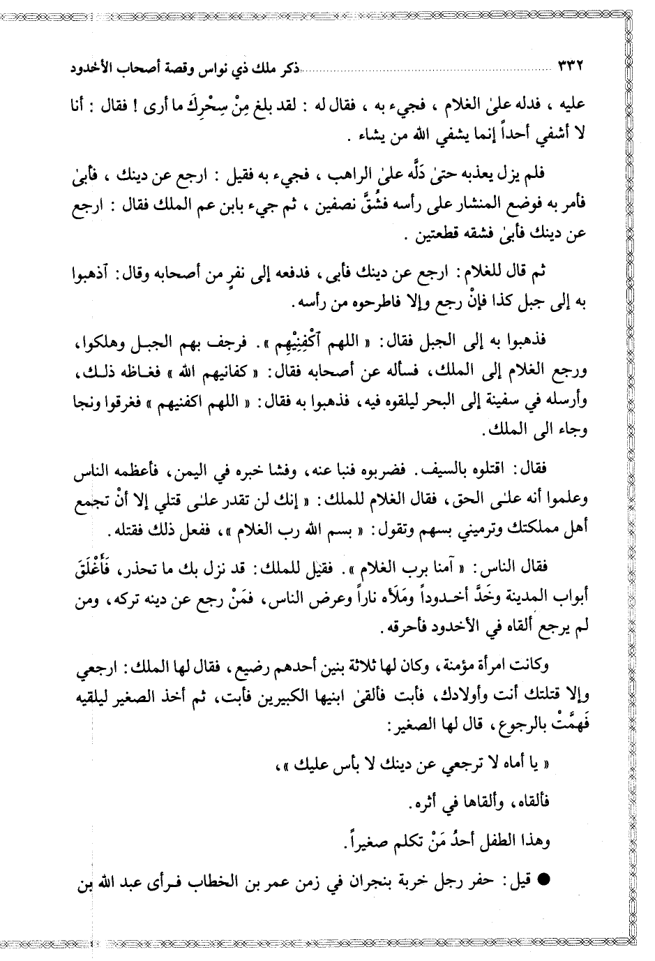 وكانت امرأة مؤمنة وكان لها ثلاثة بنين أحدهم رضيع فقال لها الملك ارجعي وإلا قتلتك أنت وأولادك فأبت فألقى ابنيها الكبيرين فأبت ثم أخذ الصغير ليلقيه فهمت بالرجوع قال لها الصغير