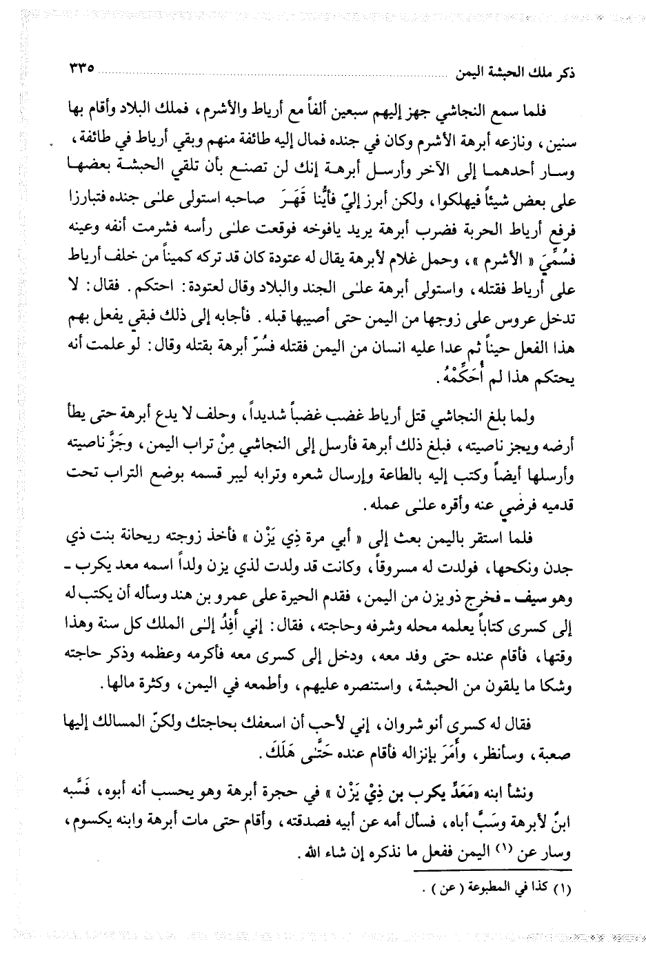 فلما استقر باليمن بعث إلى أبي مرة ذي يزن فأخذ زوجته ريحانة بنت ذي 20 . 0 جدن ونكحها فولدت له مسروقا وكانت قد ولدت لذي يزن ولدا اسمه معد يكرب وهو سيف فخرج ذو يزن من اليمن فقدم الحيرة على عمرو بن هند وسأله أن يكتب له إلى كسرى كتابا يعلمه محله وشرفة وحاجته فقال إني قد أفد إلى الملك كل سنة وهذا وقتها فأقام عنده حتى وفد معه ودخل إلى كسرى معه فأكرمه وعظمه وذكر حاجته وشكا ما يلقون من الحبشة واستنصره عليهم وأطمعه في اليمن وكثرة مالها