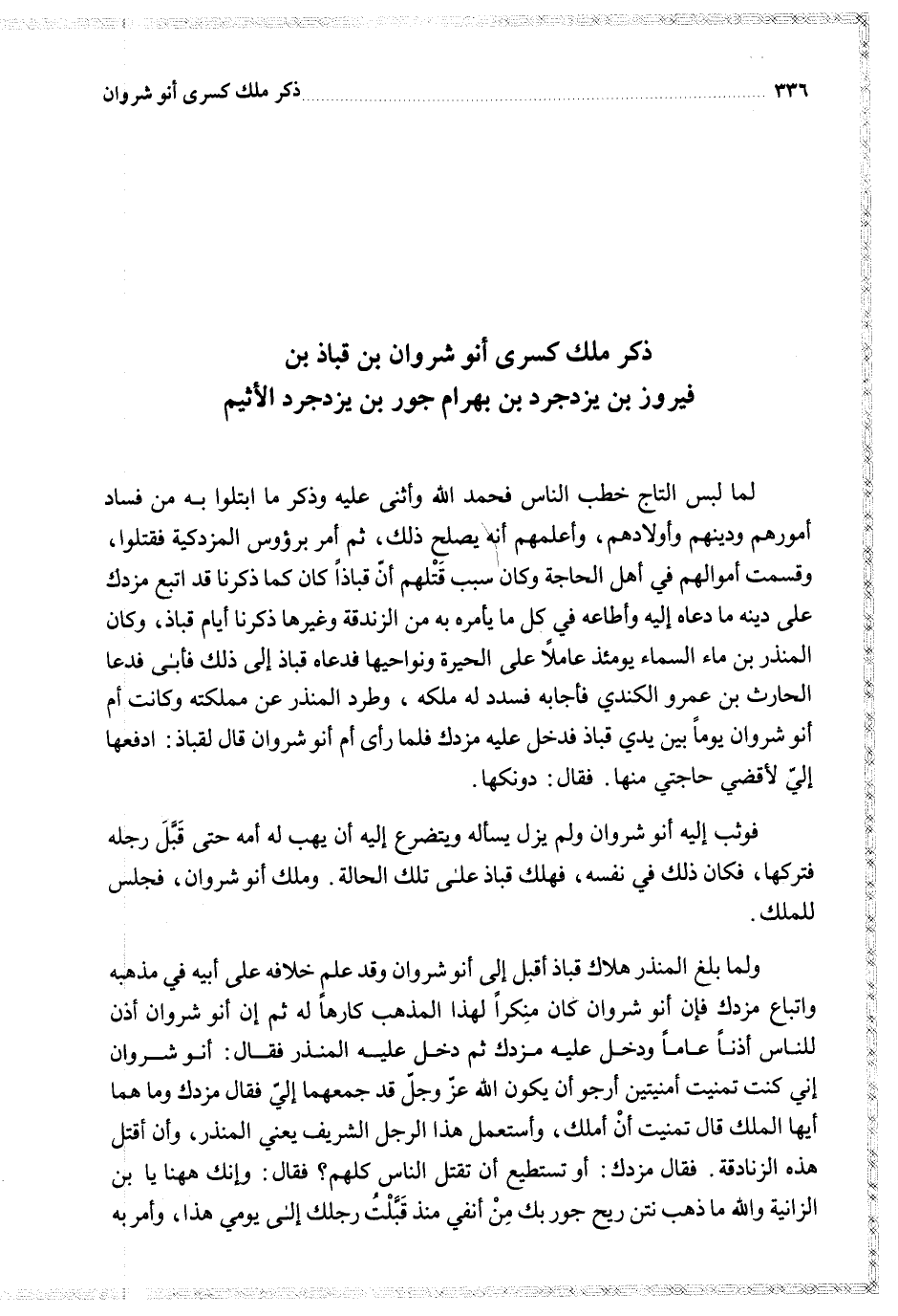 ولما بلغ المنذر هلاك قباذ أقبل إلى أنوشروان وقد علم خلافه على أبيه في مذهبه واتباع مزدك فإن أنوشروان كان منكرا لهذا المذهب كارها له ثم إن أنوشروان أذن للناس أذنا عاما ودخل عليه مزدك ثم دخل عليه المنذر فقال أنوشروان إني كنت تمنيت أمنيتين أرجو أن يكون الله عز وجل قد جمعهما إلي فقال مزدك وما هي أيها الملك قال تمنيت أن أملك وأستعمل هذا الرجل الشريف يعني المنذر وأن أقتل هذه الزنادقة فقال مزدك أو تستطيع أن تقتل الناس كلهم فقال وإنك ههنا يا بن الزانية والله ما ذهب نتن ريح جوربك من أنفي منذ قبلت رجلك إلى يومي هذا وأمر به