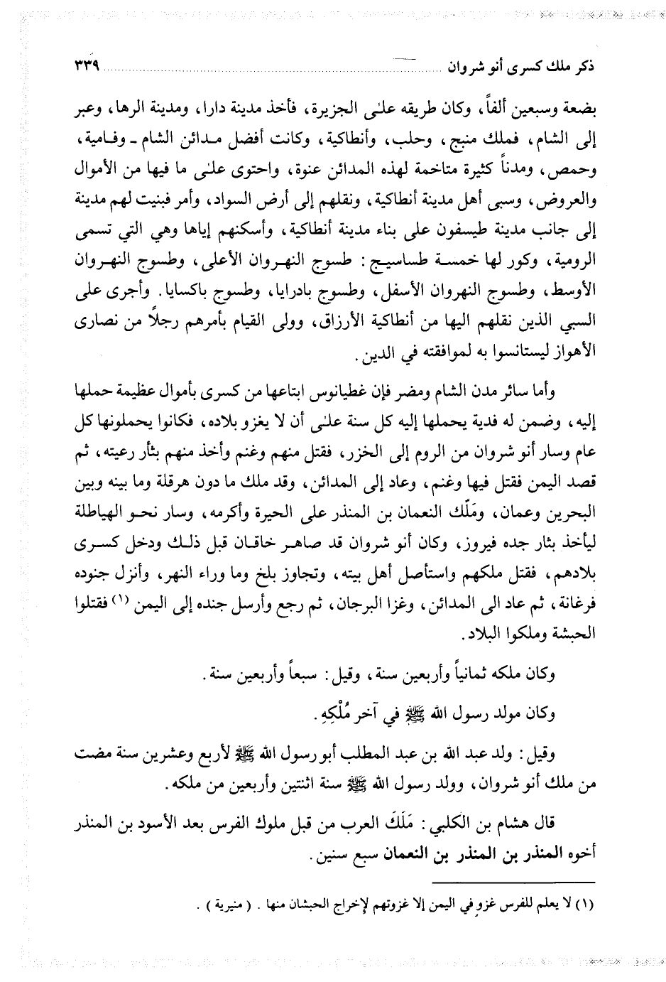 وقيل ولد عبد الله بن عبد المطلب أبو رسول الله لأربع وعشرين سنة مضت من ملك أنوشروان وولد رسول الله سنة اثنين وأربعين من ملكه