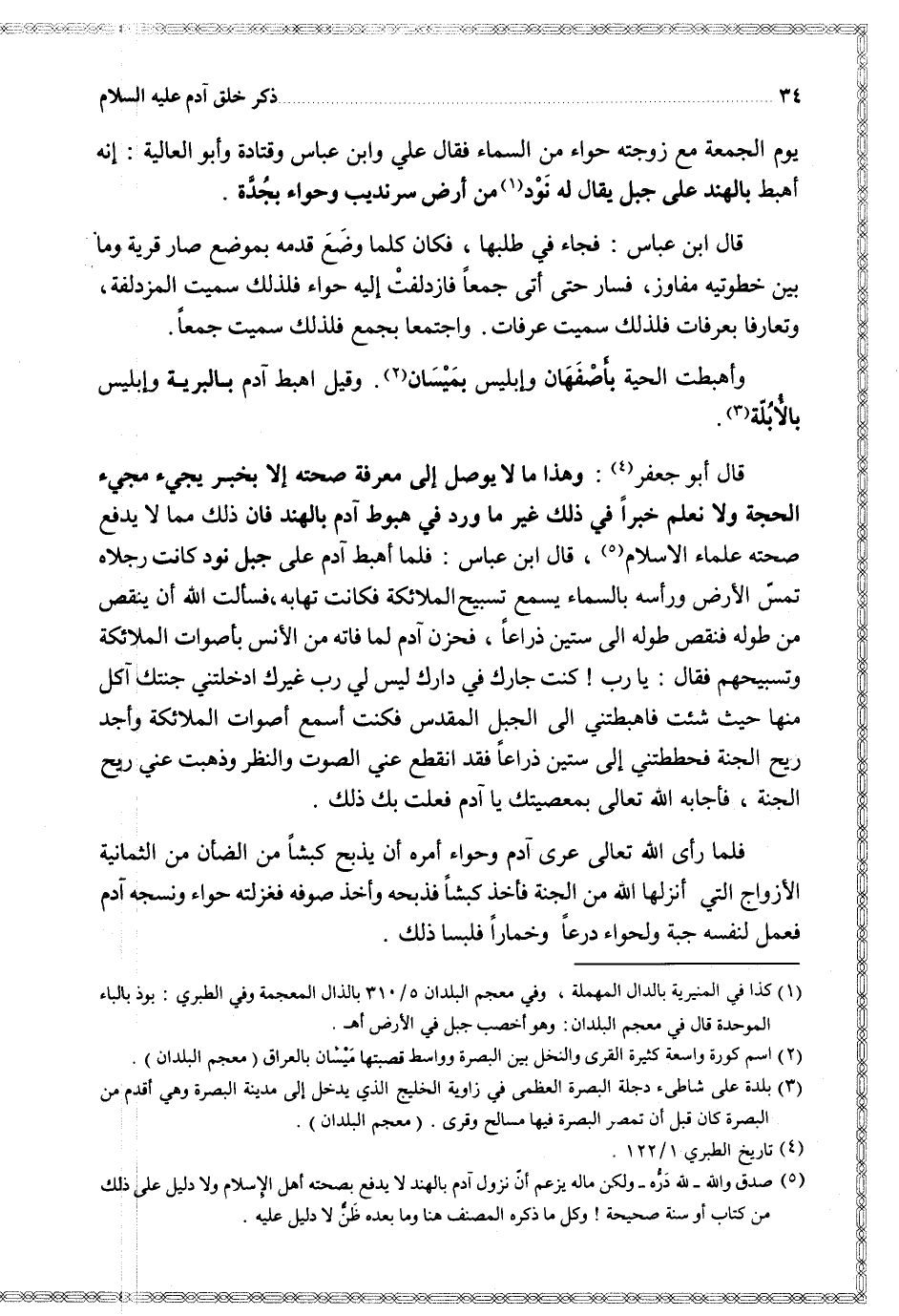 قال أبو جعفر وهذا ما لا يوصل إلى معرفة صحته إلا بخبر يجئ مجئ الحجة ولا نعلم خبرا في ذلك غير ما ورد في هبوط آدم بالهند فان ذلك مما لا يدفع صحته علماء الاسلام قال ابن عباس فلما أهبط آدم على جبل نود كانت رجلاه تمس الأرض ورأسه بالسماء يسمع تسبيح الملائكة فكانت تهابه فسألت الله أن ينقص من طوله فنقص طوله إلى ستين ذراعا فحزن آدم لما فاته من الأنس بأصوات الملائكة وتسبيحهم فقال يا رب كنت جارك في دارك ليس لي رب غيرك أدخلتني جنتك آكل منها حيث شئت فاهبطتني إلى الجبل المقدس فكنت أسمع أصوات الملائكة وأجد ريح الجنة فحططتني إلى ستين ذراعا فقد انقطع عني الصوت والنظر وذهبت عني ريح الجنة فأجابه الله تعالى بمعصيتك يا آدم فعلت بك ذلك
