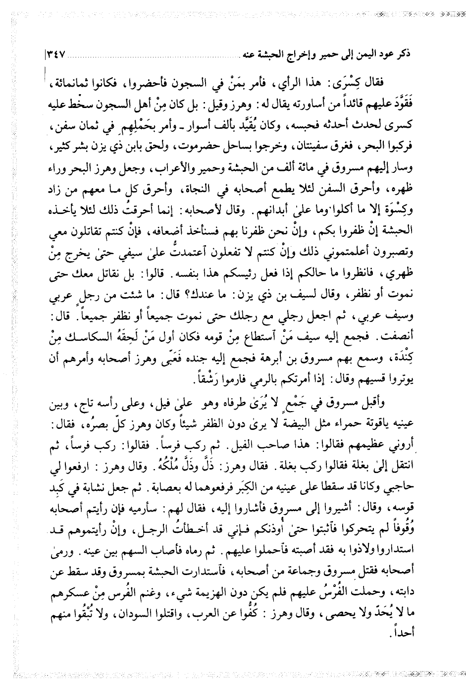 وأقبل مسروق في جمع لا يرى طرفاه وهو على فيل وعلى رأسه تاج وبين عينيه ياقوته حمراء مثل البيضة لا يرى دون الظفر شيئا وكان وهرز كل بصره فقال أروني عظيمهم فقالوا هذا صاحب الفيل ثم ركب فرسا فقالوا ركب فرسا ثم انتقل إلى بغلة فقالوا ركب بغلة فقال وهرز ارفعوا لي حاجبي وكانا قد سقطا على عينيه من الكبر فرفعوهما لها بعصابة ثم جعل نشابة في كبد قوسه وقال أشيروا إلى مسروق فأشاروا إليه فقال لهم سأرميه فإن رأيتم أصحابه وقوفا لم يتحركوا فاثبتوا حتى أوذنكم فإني قد أخطأت الرجل وإن رأيتموهم قد استداروا ولاذوا به فقد أصبته فاحملوا عليهم ثم رماه فأصاب السهم بين عينيه ورمى أصحابه فقتل مسروق وجماعة من أصحابه فاستدارت الحبشة بمسروق وقد سقط عن دابته وحملت الفرس عليهم فلم يكن دون الهزيمة شيء وغنم الفرس من عسكرهم مالا يحد ولا يحصى وقال وهرز كفوا عن العرب واقتلوا السودان ولا تبقوا منهم أحدا