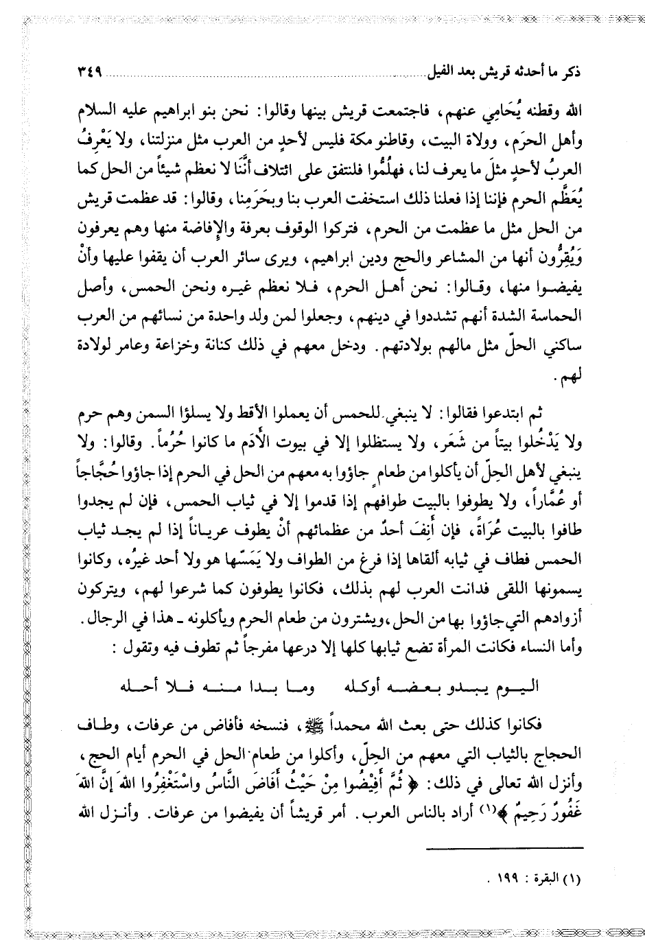 فكانوا كذلك حتى بعث الله محمدا فنسخه فأفاض من عرفات وطاف الحجاج بالثياب التي معهم من الحل وأكلوا من طعام الحل في الحرم أيام الحج وأنزل الله تعالى في ذلك { ثم أفيضوا من حيث أفاض الناس واستغفروا الله إن الله غفور رحيم } أراد بالناس العرب أمر قريشا أن يفيضوا من عرفات وأنزل الله