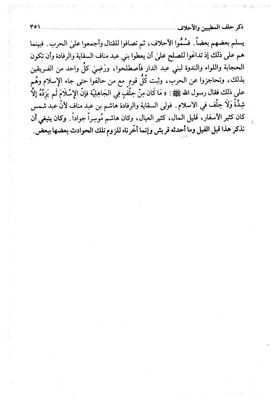 يسلم بعضهم بعضا فسموا الأحلاف ثم تصافوا للقتال وأجمعوا على الحرب فبينما هم على ذلك إذ تداعوا للصلح على أن يعطوا بني عبد المناف السقاية والرفادة وأن تكون الحجابة واللواء والندوة لبني عبد الدار فاصطلحوا ورضي كل واحد من الفريقين بذلك وتحاجزوا عن الحرب وثبت كل قوم مع من حالفوا حتى جاء الإسلام وهم على ذلك فقال رسول الله ( ما كان من حلف في الجاهلية فإن الإسلام لم يزده إلا شدة ولا حلف في الإسلام فولى السقاية والرفادة هاشم بن عبد مناف لأن عبد شمس كان كثير الأسفار قليل المال كثير العيال وكان هاشم موسرا جوادا وكان ينبغي أن نذكر هذا قبل الفيل وما أحدثته قريش وإنما أخرناه للزوم تلك الحوادث بعضها ببعض