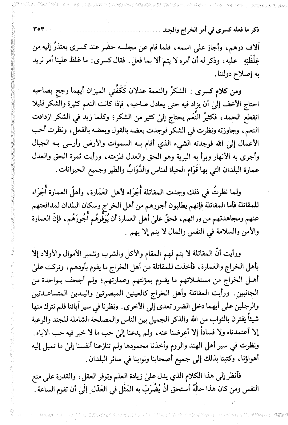 ورأيت أن المقاتلة لا يتم لهم المقام والأكل والشرب وتثمير الأموال والأولاد إلا بأهل الخراج والعمارة فأخذت للمقاتلة من أهل الخراج ما يقوم بأودهم وتركت على أهل الخراج من مستغلاتهم ما يقوم بمؤنتهم وعمارتهم ولم أجحف بواحدة من الجانبين ورأت المقاتلة وأهل الخراج كالعينين المبصرتين واليدين المتساعدتين والرجلين على أيهما دخل الضرر تعدى إلى الأخرى ونظرنا في سير آبائنا فلم نترك منها شيئا يقترن بالثواب من الله والذكر الجميل بين الناس والمصلحة الشاملة للجند والرعية إلا اعتمدناه ولا فسادا إلا أعرضنا عنه ولم يدعنا إلى حب ما لا خير فيه حب الآباء ونظرت في سير أهل الهند والروم وأخذنا محمودها ولم تنازعنا أنفسنا إلى ما تميل إليه أهواؤنا وكتبنا بذلك إلى جميع أصحابنا ونوابنا في سائر البلدان