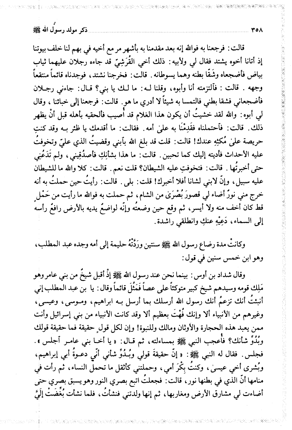 قالت فرجعنا به فوالله إنه بعد مقدمنا به بأشهر مر مع أخيه في بهم لنا خلف بيوتنا إذ أتانا أخوه يشتد فقال لي ولأبيه ذلك أخي القرشي قد جاءه رجلان عليهما ثياب بياض فأضجعاه وشقا بطنه وهما يسوطانه قالت فخرجنا نشتد فوجدناه قائما منتقعا وجهه قالت فالتزمته أنا وأبوه وقلنا له ما لك يا بني قال جاءني رجلان فأضجعاني فشقا بطني فالتمسا به شيئا لا أدري ما هو قالت فرجعنا إلى خبائنا وقال لي أبوه والله لقد خشيت أن يكون هذا الغلام قد أصيب فألحقيه بأهله قبل أن يظهر ذلك قالت فاحتملناه فقدمنا به على أمه فقالت ما أقدمك يا ظئر به وقد كنت حريصة على مكثه عندك قالت قد بلغ الله بابني وقضيت الذي علي وتخوفت عليه الأحداث فأديته إليك كما تحبين قالت ما هذا بشأنك فأصدقيني ولم تدعني حتى أخبرتها قالت فتخوفت عليه الشيطان قلت نعم قالت كلا والله ما للشيطان عليه سبيل وإن لابني لشانا أفلا أخبرك قلت بلى قالت رأيت حين حملت به أنه خرج مني نور أضاء لي قصور بصرى من الشام ثم حملت به فوالله ما رأيت من حمل قط كان أخف منه ولا أيسر ثم وقع حين وضعته وإنه لواضع يديه بالأرض رافع رأسه إلى السماء دعيه عنك وانطلقي راشدة