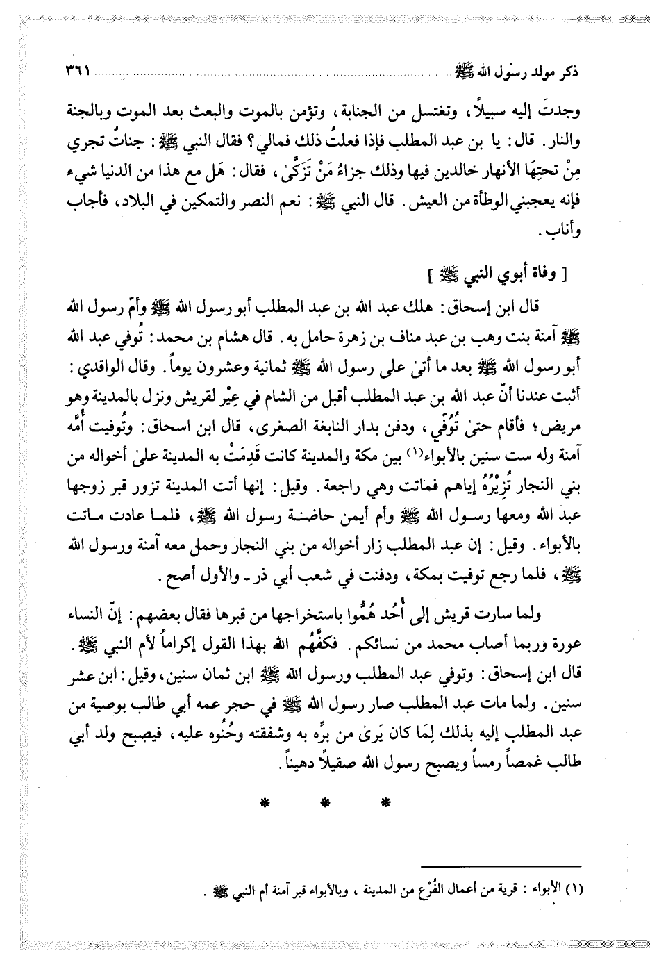 قال ابن إسحاق هلك عبد الله بن عبد المطلب أبو رسول الله وأم رسول الله آمنة بنت وهب بن عبد مناف بن زهرة حامل به قال هشام بن محمد توفي عبد الله أبو رسول الله بعد ما أتى على رسول الله ثمانية وعشرون يوما وقال الواقدي أثبت عندنا أن عبد الله بن عبد المطلب أقبل من الشام في عير لقريش ونزل بالمدينة وهو مريض فأقام حتى توفي ودفن بدار النابغة الصغرى قال ابن إسحاق وتوفيت أمه آمنة وله ست سنين بالأبواء بين مكة والمدينة كانت قدمت به المدينة على أخواله من بني النجار تزيره إياهم فماتت وهي راجعة وقيل إنها أتت المدينة تزور قبر زوجها عبد الله ومعها رسول الله وأم أيمن حاضنة رسول الله فلما عادت ماتت بالأبواء وقيل إن عبد المطلب زار أخواله من بني النجار وحمل معه آمنة ورسول الله فلما رجع توفيت بمكة ودفنت في شعب أبي ذر والأول أصح