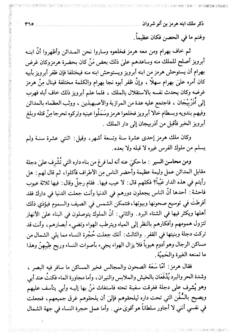 فقال هرمز أما سعة الصحون والمجالس فخير المساكن ما سفر فيه البصر وشدة الحر والبرد يدفعان بالخيش والملابس والنيران وأما مجاورة الماء فكنت عند أبي وهو يشرف على دجلة فغرقت سفينة تحته فاستغاث من بها إليه وأبي يتأسف عليهم ويصيح بالسفن التي تحت داره ليلحقوهم فإلى أن يلحقوهم غرق جميعهم فجعلت في نفسي أنني لا أجاور سلطانا هو أقوى مني وأما عمل حجرة النساء في جهة الشمال