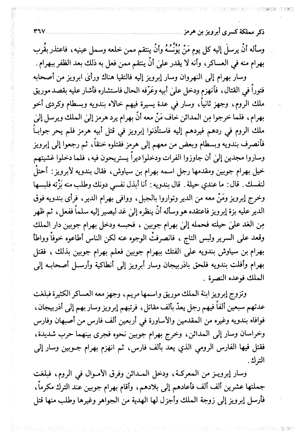 وتزوج إبرويز ابنة الملك موريق واسمها مريم وجهز معه العساكر الكثيرة فبلغت عدتهم سبعين ألفا فيهم رجل يعد بألف مقاتل فرتبهم إبرويز وسار بهم إلى أذربيجان فوافاه بندويه وغيره من المقدمين والأساورة في أربعين ألف فارس من أصبهان وفارس وخراسان وسار إلى المدائن وخرج بهرام جوبين نحوه فجرى بينهما حرب شديدة فقتل فيها الفارس الرومي الذي يعد بألف فارس ثم انهزم جوبين وسار إلى الترك