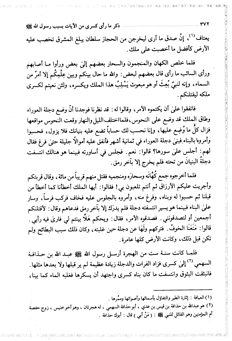 فلما كانت سنة ست من الهجرة أرسل رسول الله عبد الله بن حذافة السهمي إلى كسرى فزاد الفرات والدجلة زيادة عظيمة لم ير قبلها ولا بعدها مثل فانبثقت البثوق وانتسفت ما كان بناه كسرى واجتهد أن يسكرها فغلبه الماء كما بينا