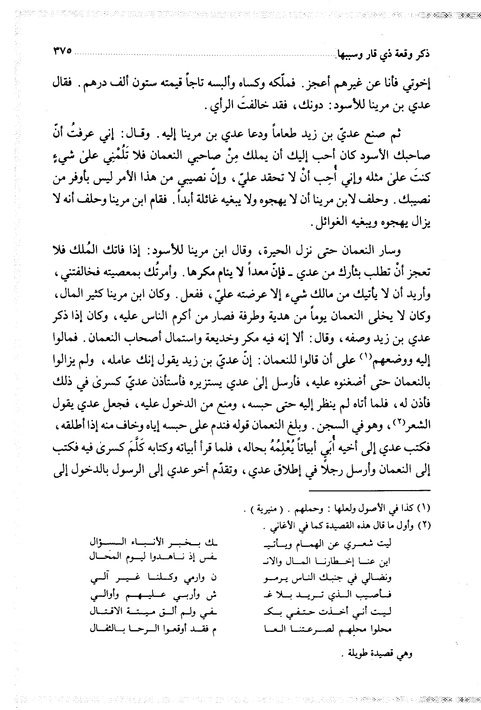 وسار النعمان حتى نزل الحيرة وقال ابن مرينا للأسود إذا فاتك الملك فلا تعجز أن تطلب بثأرك من عدي فإن معدا لا ينام مكرها وأمرتك بمعصية فخالفتني وأريد أن لا يأتيك من مالك شيء إلا عرضته علي ففعل وكان ابن مرينا كثير المال وكان لا يخلى النعمان يوما من هدية وطرفة فصار من أكرم الناس عليه وكان إذا ذكر عدي بن زيد وصفه وقال ألا إنه فيه مكر وخديعة واستمال أصحاب النعمان فمالوا إليه ووضعهم على أن قالوا للنعمان إن عدي بن زيد يقول إنك عامله ولم يزالوا بالنعمان حتى أضغنوه عليه فأرسل إلى عدي يستزيره فأستأذن عدي كسرى في ذلك فأذن له فلما أتاه لم ينظر إليه حتى حبسه ومنع من الدخول عليه فجعل عدي يقول الشعر وهو في السجن وبلغ النعمان قوله فندم على حبسه إياه وخاف منه إذا أطلقه فكتب عدي إلى أخيه أبي أبياتا يعلمه بحاله فلما قرأ أبياته وكتابه كلم كسرى فيه فكتب إلى النعمان وأرسل رجلا في إطلاق عدي وتقدم أخو عدي إلى الرسول بالدخول إلى