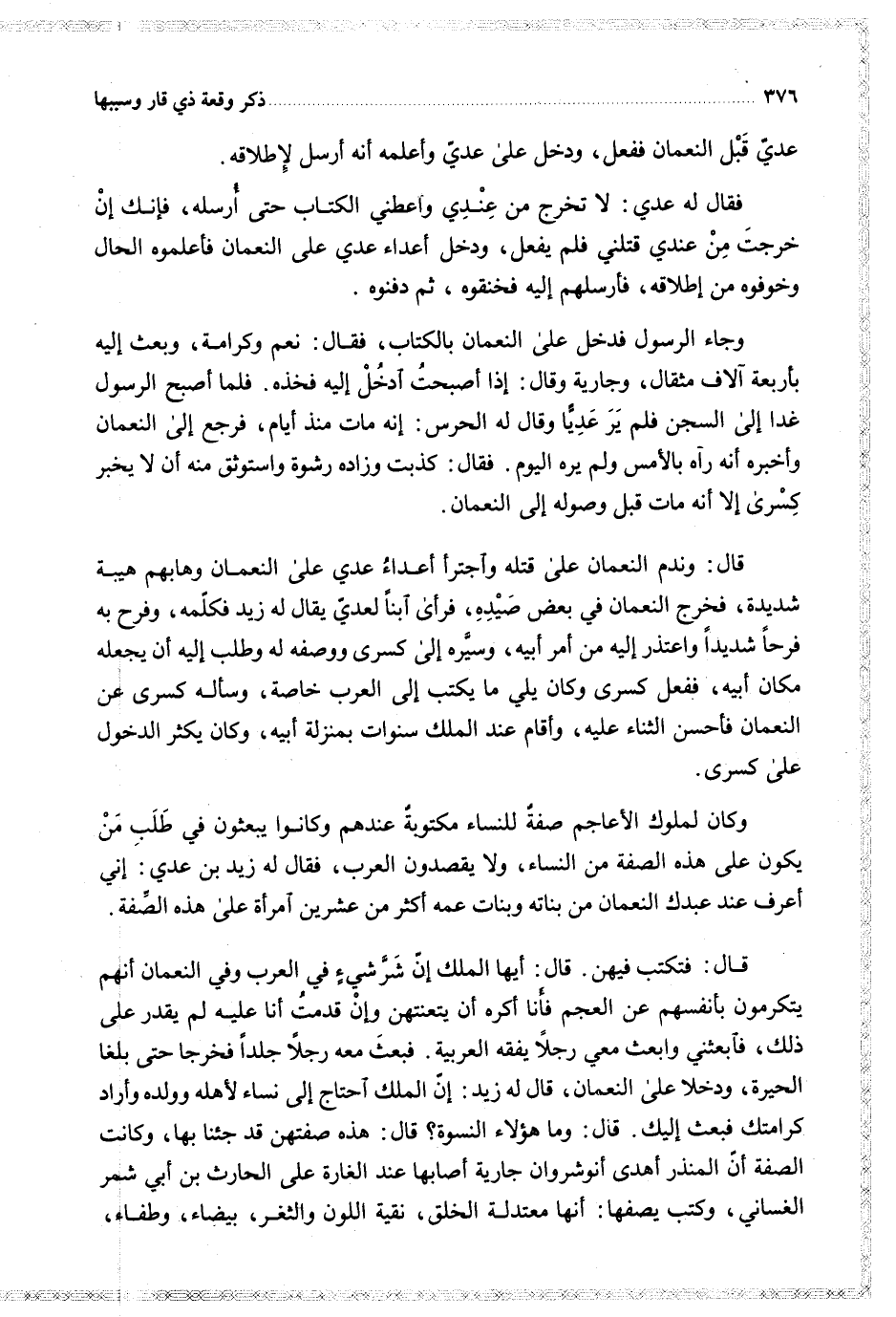 وكان لملوك الأعاجم صفة للنساء مكتوبة عندهم وكانوا يبعثون في طلب من يكون على هذه الصفة من النساء ولا يقصدون العرب فقال له زيد بن عدي إني أعرف عند عبدك النعمان من بناته وبنات عمه أكثر من عشرين امرأة على هذه الصفة