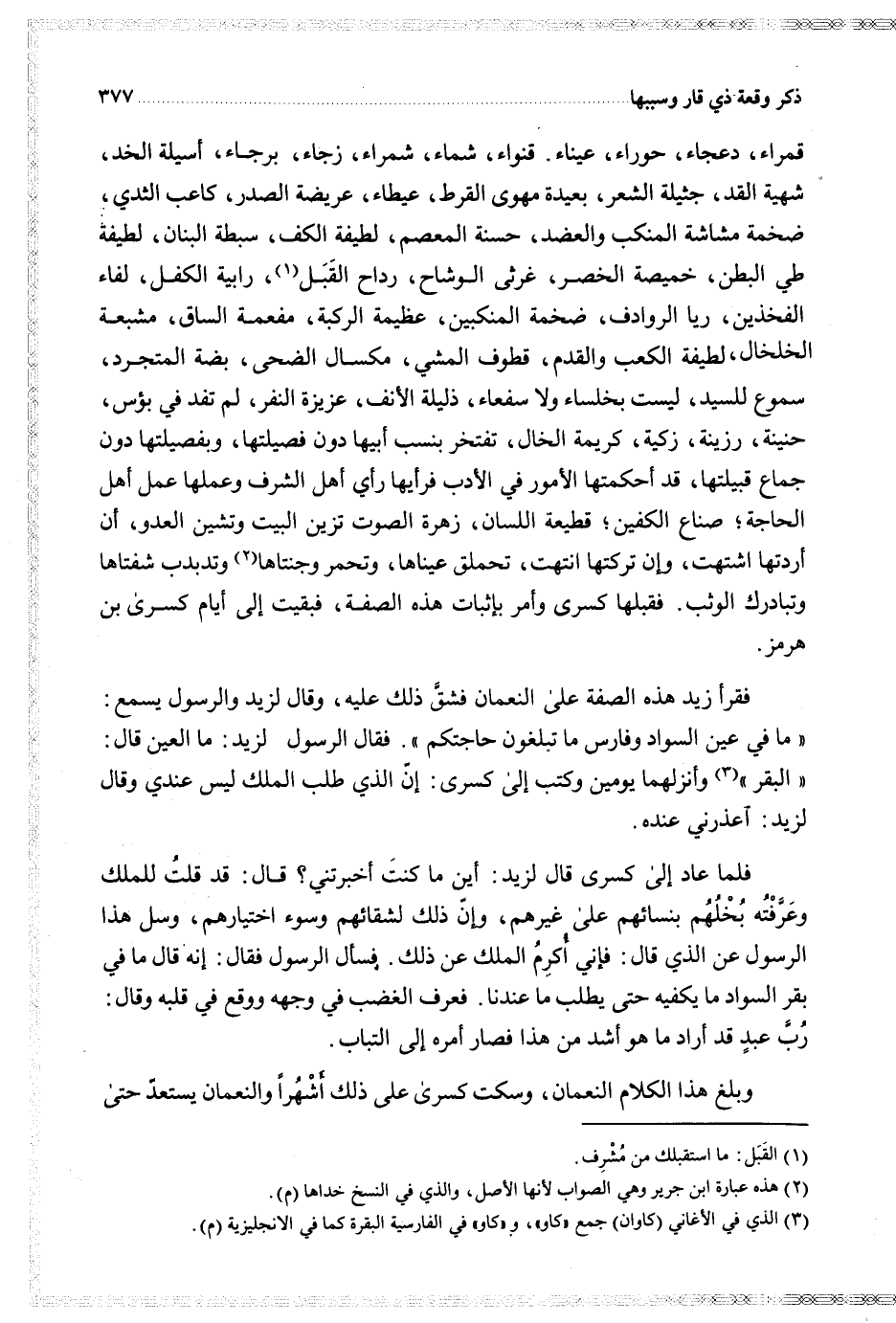 فقرأ زيد هذه الصفة على النعمان فشق ذلك عليه وقال لزيد والرسول يسمع ما في عين السواد وفارس ما تبلغون حاجتكم فقال الرسول لزيد ما العين قال البقر وأنزلهما يومين وكتب إلى كسرى إن الذي طلب الملك ليس عندي وقال لزيد اعذرني عنده