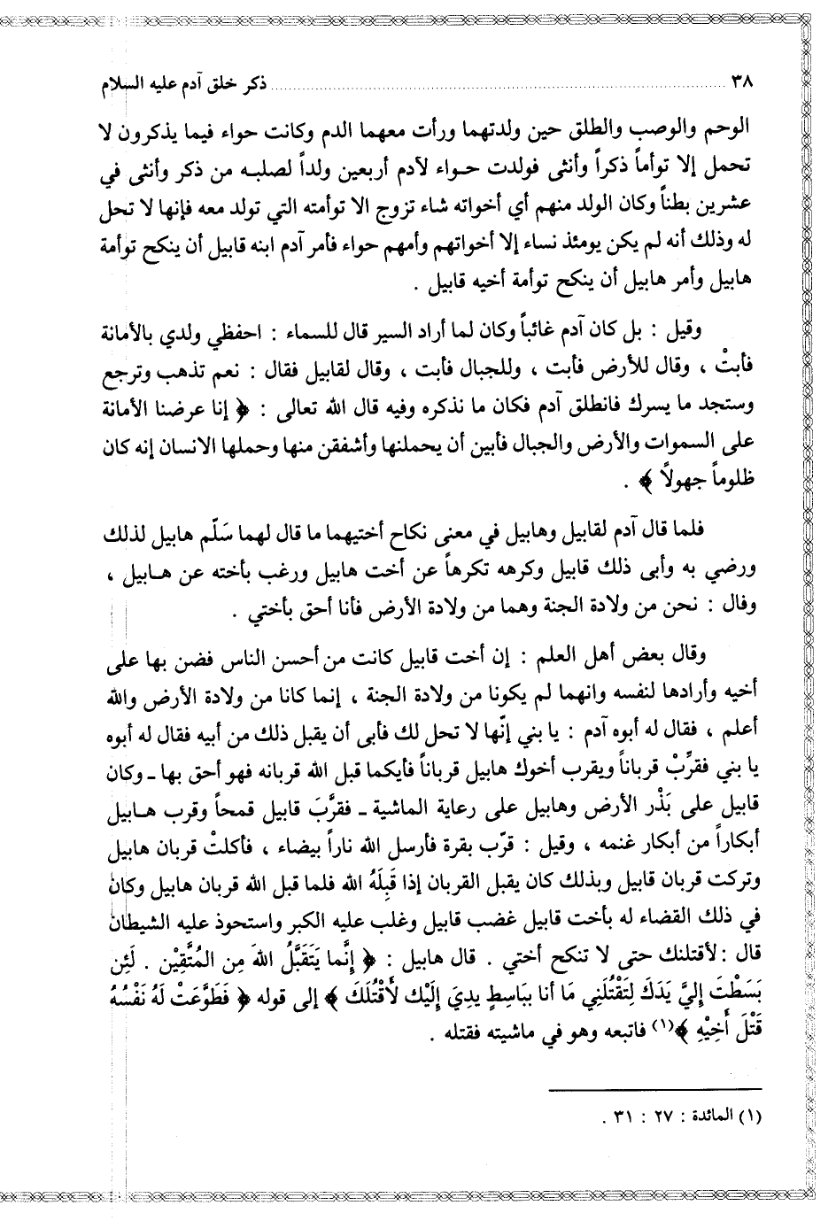 فلما قال آدم لقلبيل وهابيل في معنى نكاح أختيهما ما قال لهما سلم هابيل لذلك ورضي به وأبى ذلك قابيل وكرهه تكرها عن أختهابيل ورغب بأخته عن هابيل وفال: نحن من ولادة الجنة وهما من ولادة الأرض فأنا أحق بأختي