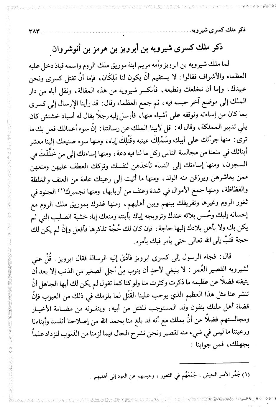 قال فجاء الرسول إلى كسرى ابرويز فأدى إليه الرسالة فقال ابرويز قل عني لشيرويه القصير العمر لا ينبغي لأحد أن يتوب من أجل الصغير من الذنب إلا بعد أن يتيقنه فضلا عن عظيمه ما ذكرت وكثرت منا ولو كنا كما تقول لم يكن لك أيها الجاهل أن تنشر عنا مثل هذا العظيم الذي يوجب علينا القتل لما يلزمك في ذلك من العيوب فإن قضاة أهل ملتك ينفون ولد المستوجب للقتل من أبيه وينفونه من مضامة الأخيار ومجالستهم فضلا عن أن يملك مع أنه قد بلغ منا بحمد الله من إصلاحنا أنفسنا وأبناءنا ورعيتنا ما ليس في شيء منه تقصير ونحن نشرح الحال فيما لزمنا من الذنوب لتزداد علما بجهلك فمن جوابنا
