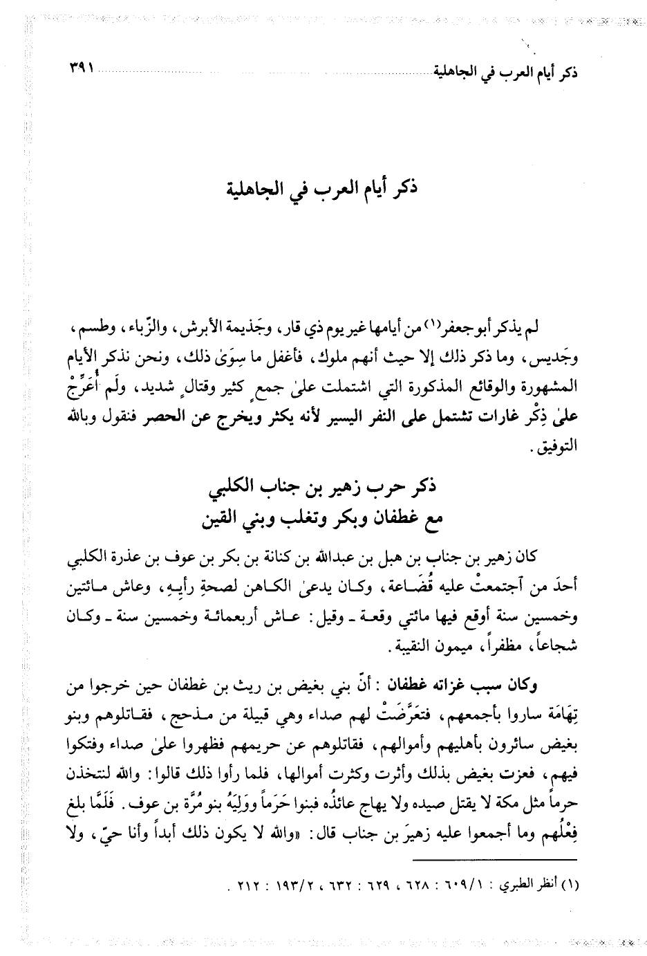 لم يذكر أبو جعفر من أيامها غير يوم ذي قار وجذيمة الأبرش والزباء وطسم وجديس وما ذكر ذلك إلا حيث أنهم ملوك فأغفل ما سوى ذلك ونحن نذكر الأيام المشهورة والوقائع المذكورة التي اشتملت على جمع كثير وقتال شديد ولم أعرج على ذكر غارات تشتمل على النفر اليسير لأنه يكثر ويخرج عن الحصر فنقول وبالله التوفيق