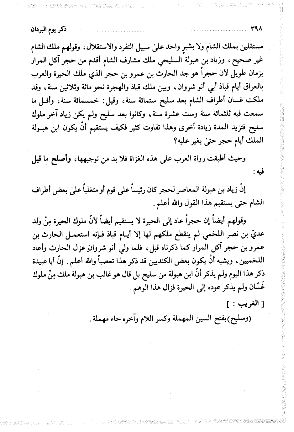 وقولهم أيضا إن حجر عاد إلى الحيرة لا يستقيم أيضا لأن ملوك الحيرة من ولد عدي بن نصر اللخمي لم ينقطع ملكهم لها إلا أيام قباذ فإنه استعمل الحارث بن عمرو بن حجر آكل المرار كما ذكرناه قبل فلما ولي أنوشروان عزل الحارث وأعاد اللخميين ويشبه أن يكون بعض الكنديين قد ذكر هذا تعصبا والله أعلم إن أبا عبيدة ذكر هذا اليوم ولم يذكر أن ابن هبولة من سليح بل قال هو غالب بن هبولة ملك من ملوك غسان ولم يذكر عوده إلى الحيرة فزال هذا الوهم