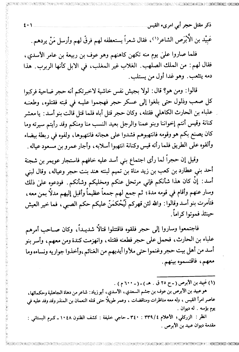 قالوا ومن هو قال لولا بجيش نفس خاشية لاخبرتكم أنه حجر ضاحية فركبوا كل صعب وذلول حتى بلغوا إلى عسكر حجر فهجموا عليه في قبته فقتلوه وطعنه علباء بن الحارث الكاهلي فقتله وكان حجر قتل أباه فلما قتل قالت بنو أسد يا معشر كنانة وقيس أنتم إخواننا وبنو عمنا والرجل بعيد النسب منا ومنكم وقد رأيتم سيرته وما كان يصنع بكم هو وقومه فانتهبوهم فشدوا على هجانه فانتهبوها ولفوه في ربطة بيضاء وألقوه على الطريق فلما رأته قيس وكنانة أنتهبوا أسلابه وأجار عمرو بن مسعود عياله