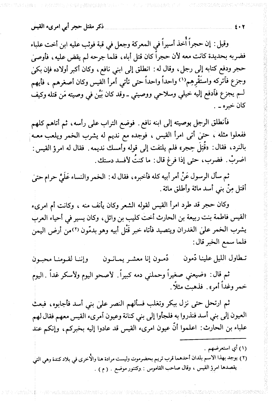 فانطلق الرجل بوصيته إلى ابنه نافع فوضع التراب على رأسه ثم أتاهم كلهم ففعلوا مثله حتى أتى امرأ القيس فوجده مع نديم له يشرب الخمر ويلعب معه بالنرد فقال قتل حجر فلم يلتفت إلى قوله وأمسك نديمه فقال له امرؤ القيس اضرب فضرب حتى إذا فرغ قال ما كنت لأفسد دستك
