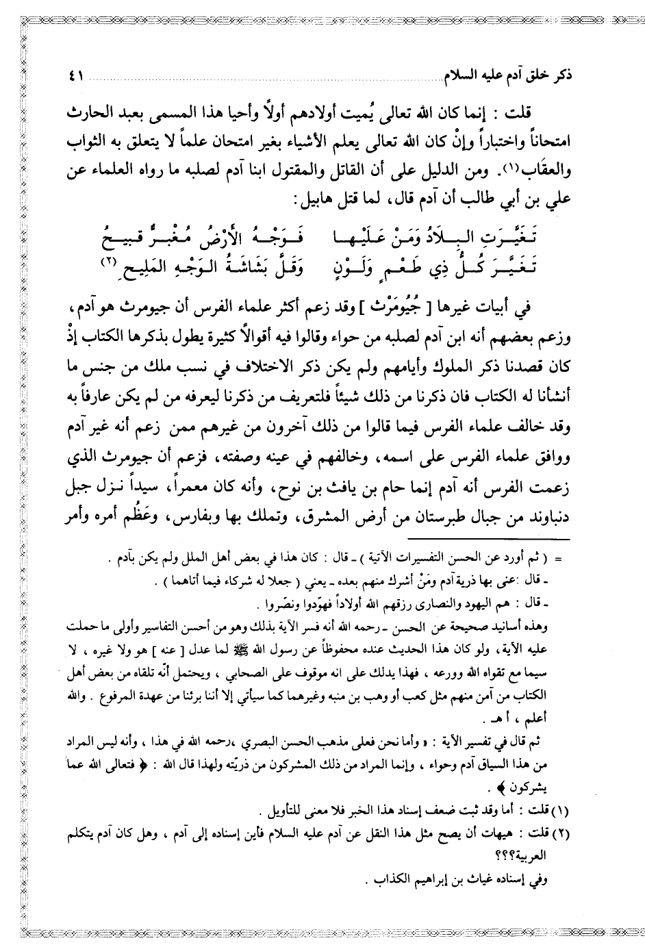 قلت إنما كان الله تعالى يميت أولادهم اولا وأحيا هذا المسمى بعبد الحارث امتحانا واختبارا وإن كان الله تعالى يعلم الأشياء بغير امتحان علما لا يتعلق به الثواب والعقاب ومن الدليل على أن القاتل والمقتول ابنا آدم لصلبه ما رواه العلماء عن علي بن أبي طالب أن آدم قال لما قتل هابيل