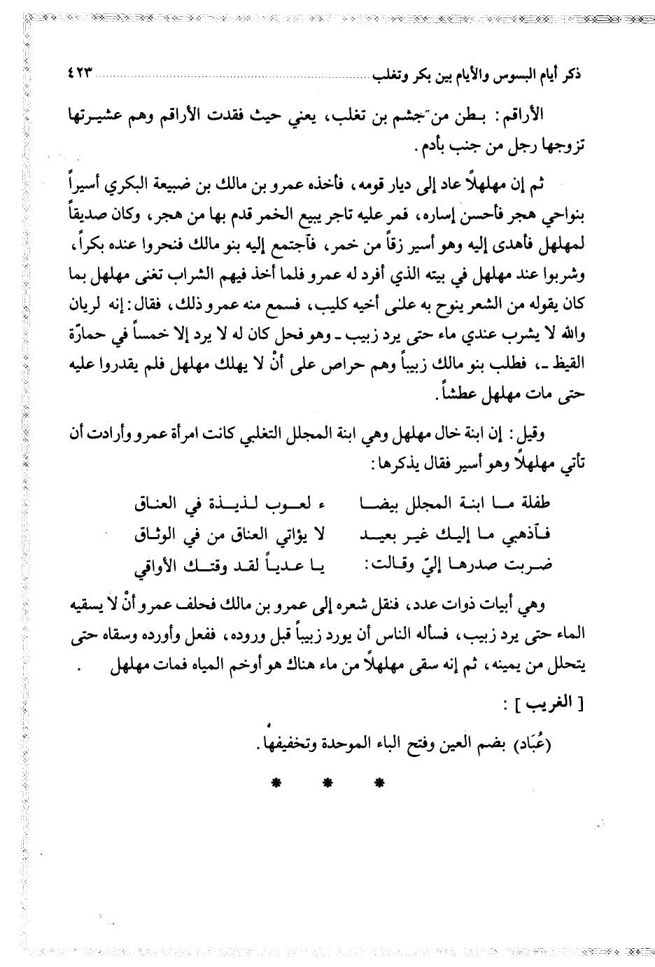 ثم إن مهلهلا عاد إلى ديار قومه فأخذه عمرو بن مالك بن ضبيعة البكري أسيرا بنواحي هجر فأحسن إساره فمر عليه تاجر يبيع الخمر قدم بها من هجر وكان صديقا لمهلهل فأهدى إليه وهو أسير زقا من خمر فاجتمع إليه بنو مالك فنحروا عنده بكرا وشربوا عند مهلهل في بيته الذي أفرد له عمرو فلما أخذ فيهم الشراب تغني مهلهل بما كان يقوله من الشعر ينوح على أخيه كليب فسمع منه عمرو ذلك فقال إنه يريد لريان والله لا يشرب عندي ماء حتى يرد زبيب وهو فحل كان له لا يراد إلا خمسا في حمارة القيظ فطلب بنو مالك زبيبا وهم حراص على أن لا يهلك مهلهل فلم يقدروا عليه حتى مات مهلهل عطشا