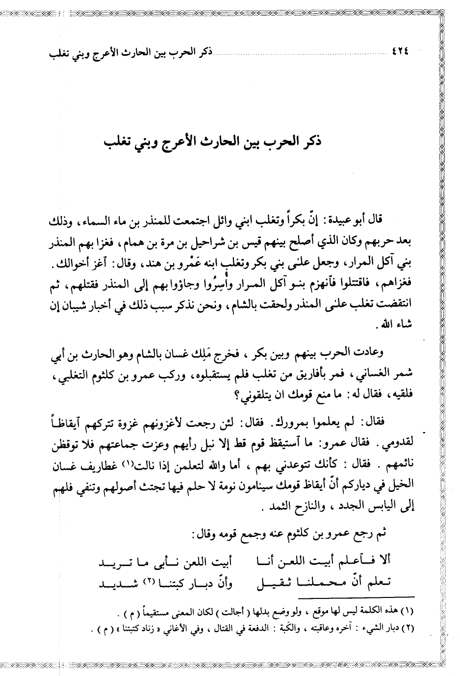 وعادت الحرب بينهم وبين بكر فخرج ملك غسان بالشام وهو الحارث بن أبي شمر الغساني فمر بأفاريق من تغلب فلم يستقبلوه وركب عمرو بن كلثوم التغلبي فلقيه فقال له ما منع قومك ان يلتقوني