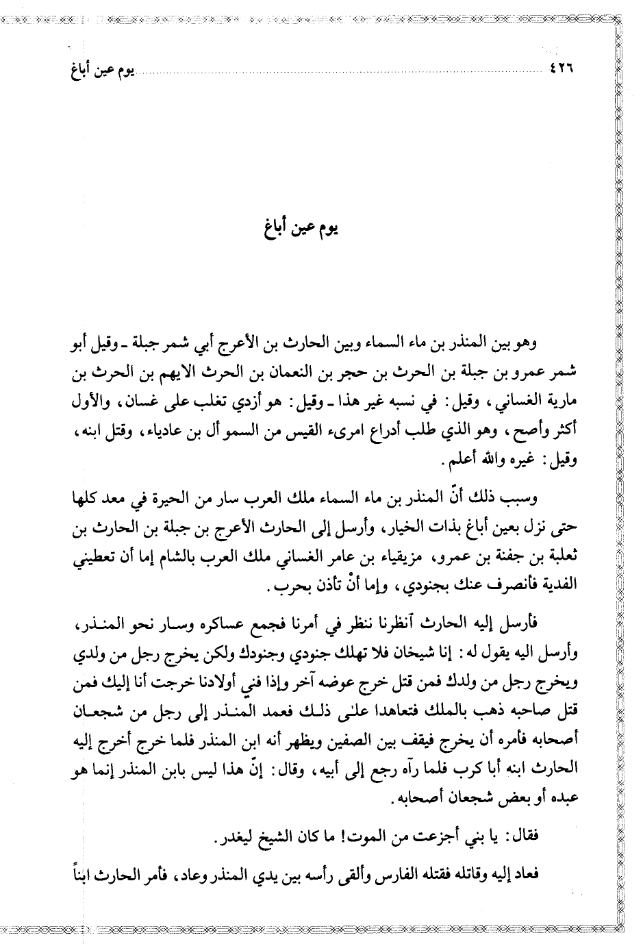 وهو بين المنذر بن ماء السماء وبين الحارث بن الأعرج أبي شمر جبلة وقيل أبو شمر عمرو بن جبلة بن الحرث بن حجر بن النعمان بن الحرث الايهم بن الحرث بن مارية الغساني وقيل في نسبه غير هذا وقيل هو أزدي تغلب على غسان والأول أكثر وأصح وهو الذي طلب أدراع امرئ القيس من السمو أل بن عادياء وقتل ابنه وقيل غيره والله أعلم