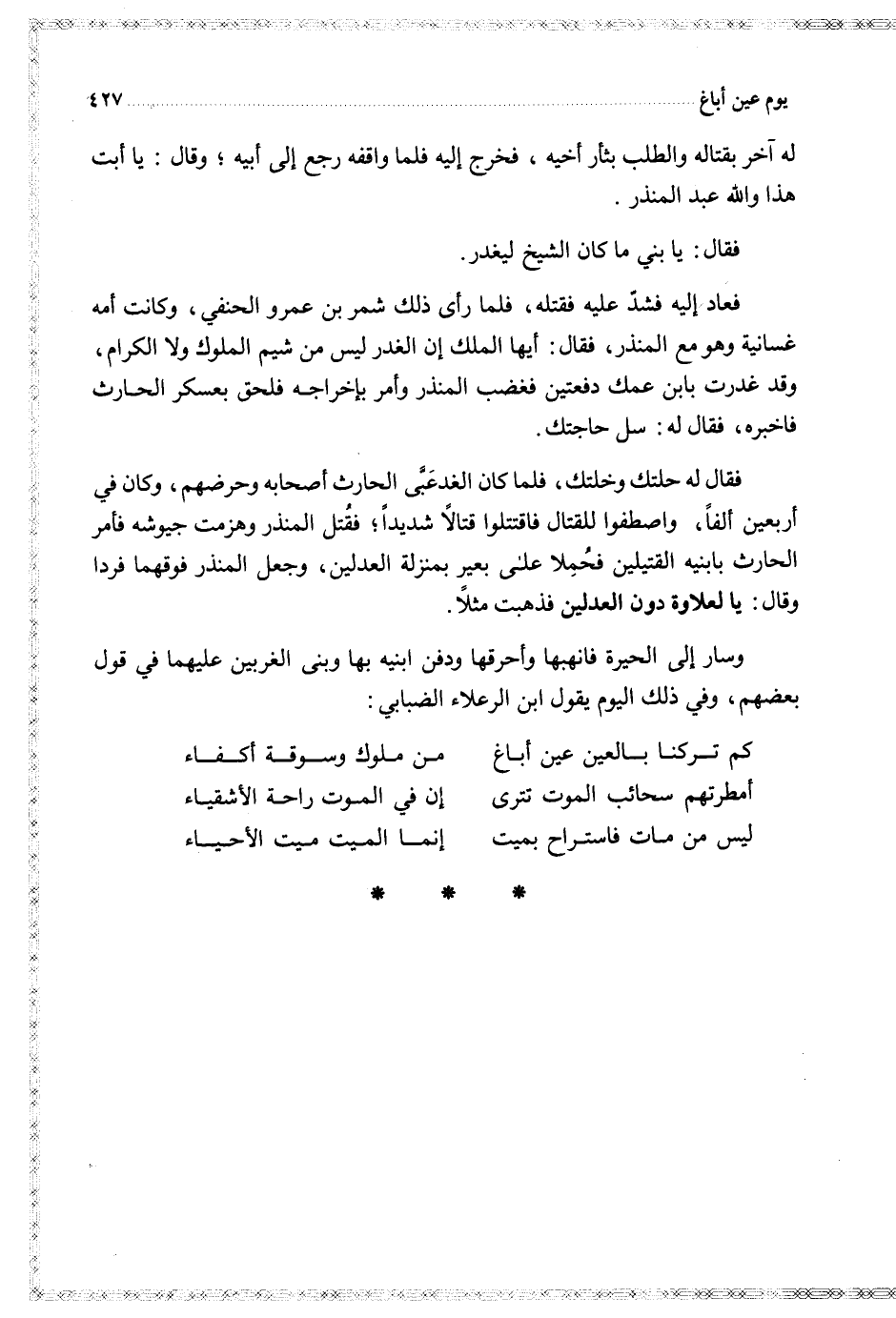 فقال له حلتك وخلتك فلما كان الغد عبى الحارث أصحابه وحرضهم وكان في أربعين ألفا واصطفوا للقتال فاقتتلوا قتالا شديدا فقتل المنذر وهزمت جيوشه فأمر الحارث بابنيه القتيلين فحملا على بعير بمنزلة العدلين وجعل المنذر فوقهما فردا وقال يا لعلاوة دون العدلين فذهبت مثلا